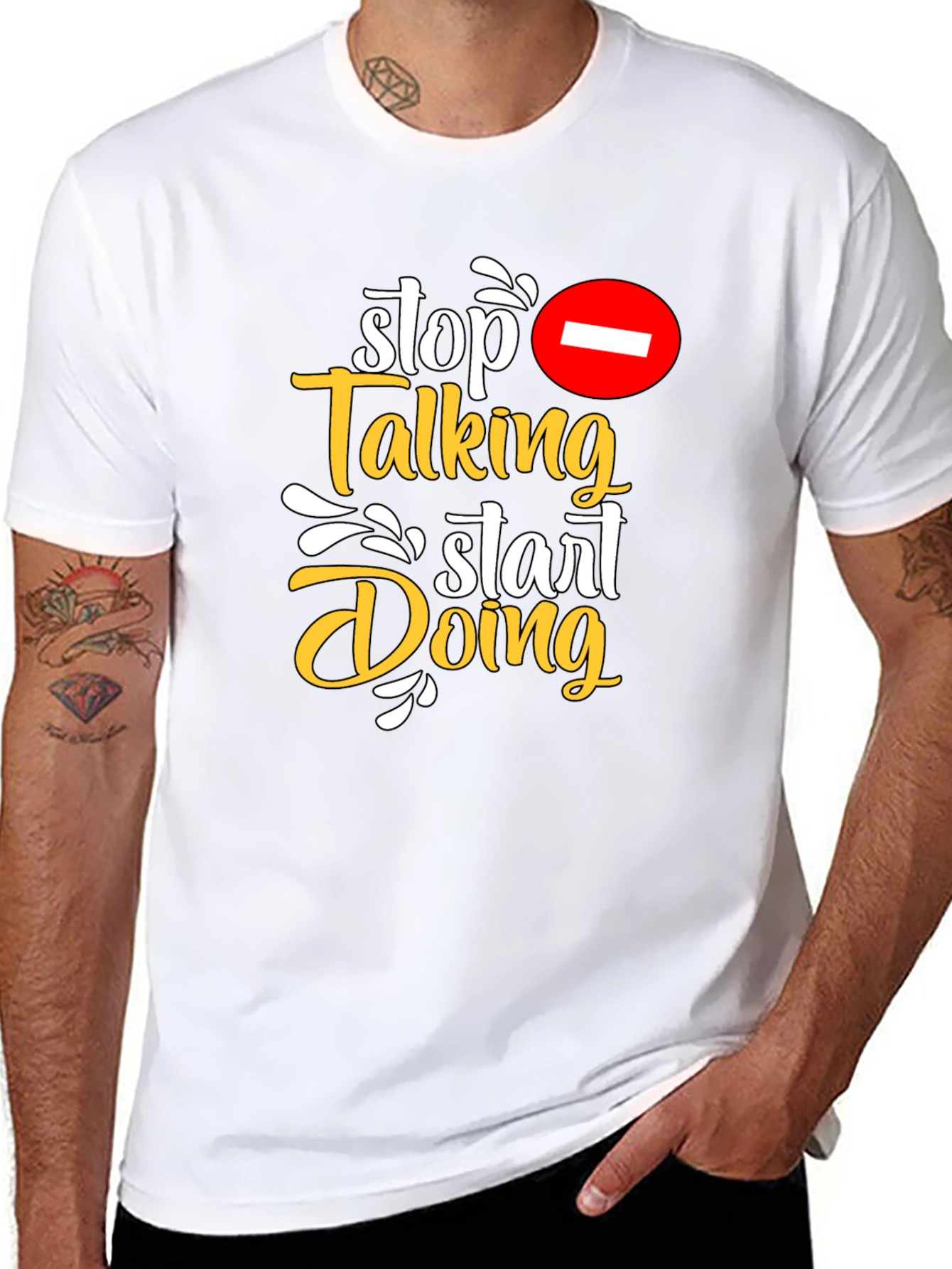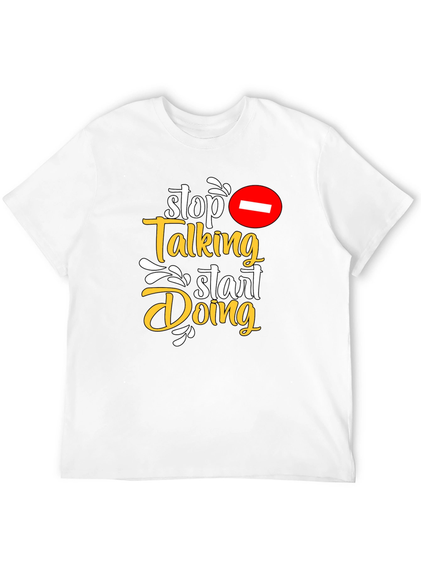 Show off your motivation with this stylish black t-shirt. The design features the text "Stop Talking Start Doing" in a mix of white and gold fonts, accented with decorative elements and a prohibition symbol. The shirt has a classic crew neck and short sleeves for a comfortable fit. Ideal for casual wear, workouts, or expressing your ambition in everyday life. Wear this tee as a reminder to take action and achieve your goals. Make a statement without saying a word!