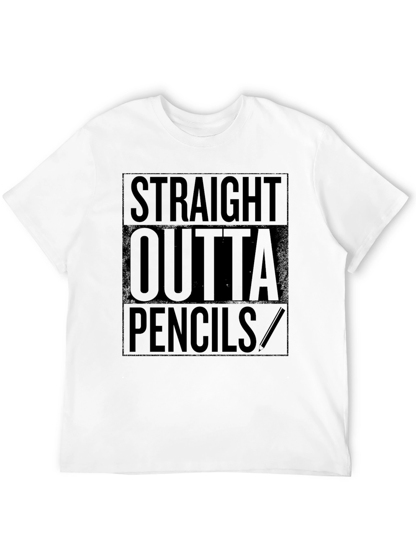 Show off your creative side with this stylish black t-shirt. Featuring a bold graphic print that reads "STRAIGHT OUTTA PENCILS," this tee is perfect for artists, writers, students, or anyone who appreciates a touch of wit in their wardrobe. The shirt appears to be made from a soft, comfortable fabric, ensuring all-day wearability. The classic crew neck and short sleeve design offer a versatile fit, making it easy to pair with jeans, shorts, or casual pants. Whether you're heading to class, working on your latest masterpiece, or simply hanging out with friends, this t-shirt is sure to make a statement and spark conversation.