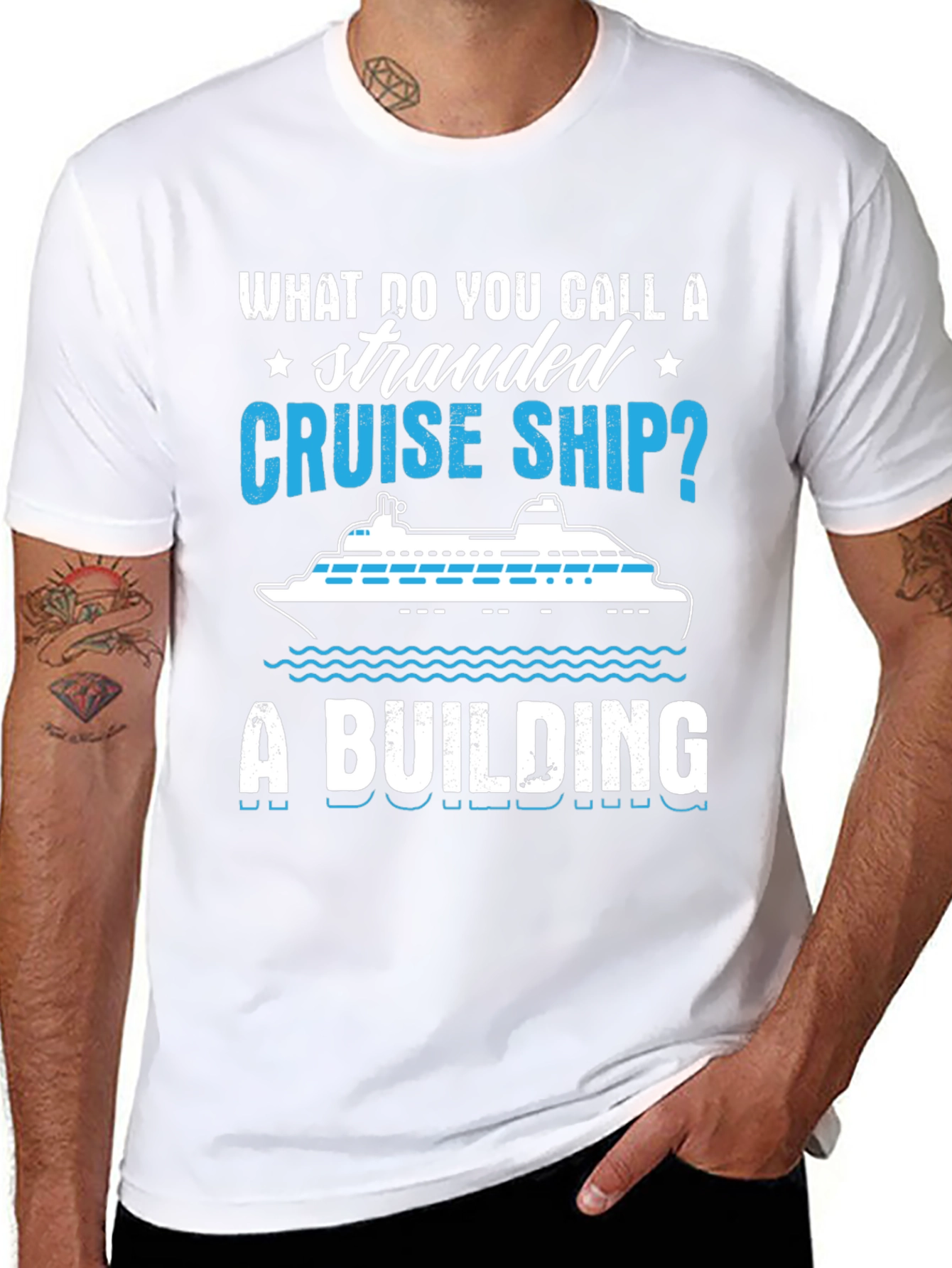 This eye-catching black t-shirt features a humorous saying and design. Emblazoned on the front is the question: "What do you call a stranded cruise ship?" followed by the answer, "A BUILDING". A detailed graphic of a cruise ship sits between the question and answer. The design is printed in white and blue, creating a striking contrast against the shirt's black background. Made from a comfortable-looking fabric, this tee is perfect for casual wear, cruise vacations, or as a fun gift for nautical humor enthusiasts. Show off your witty side with this unique and playful t-shirt.