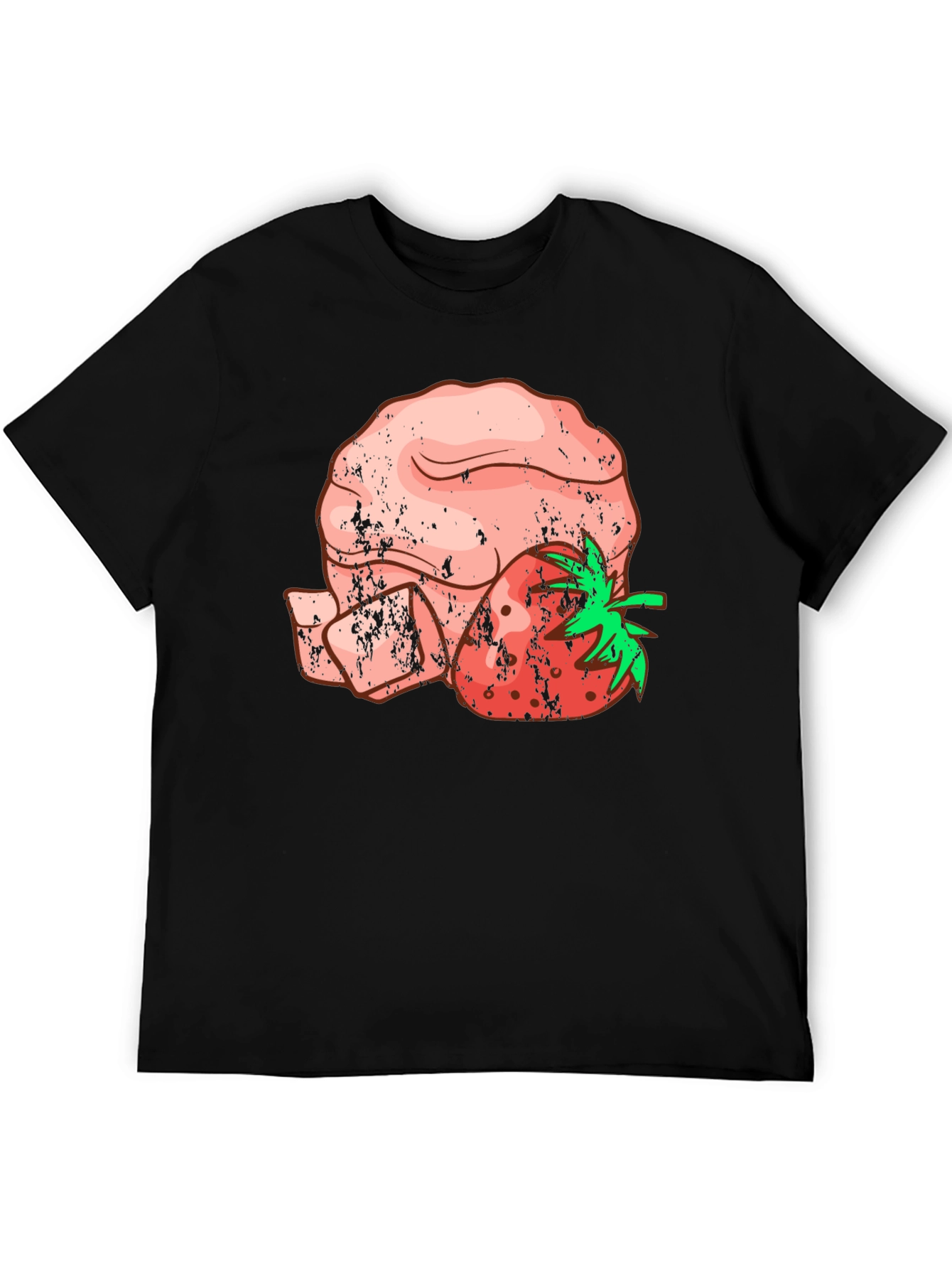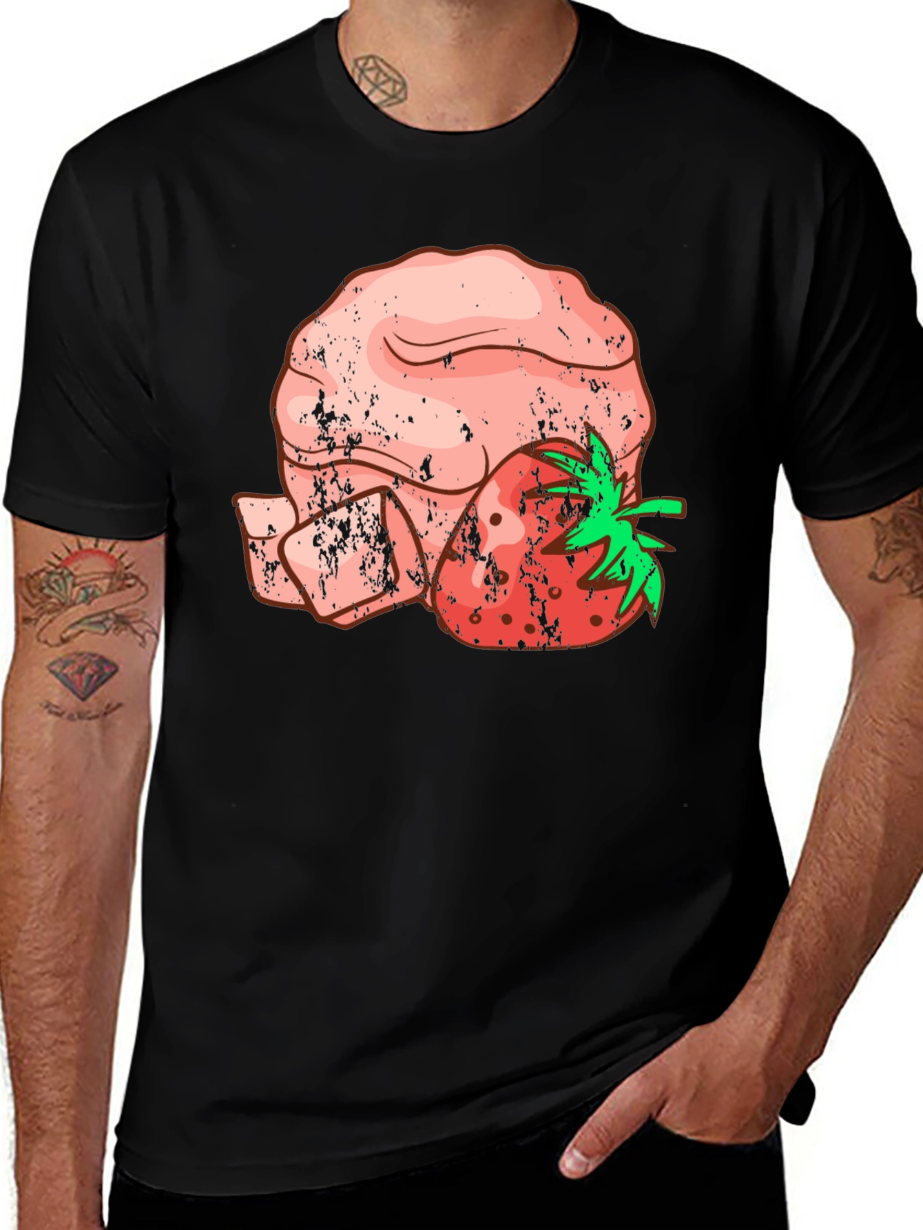 Make a statement with this unique black t-shirt featuring a bold graphic print. The design showcases a stylized fist holding a strawberry, rendered with a distressed effect for a vintage feel. The shirt appears to be made from a soft, comfortable fabric, ideal for everyday wear. This tee offers a relaxed fit, suitable for casual outings, concerts, or expressing your individual style. Pair it with jeans or shorts for an effortlessly cool look. The eye-catching graphic is sure to spark conversations and set you apart from the crowd.