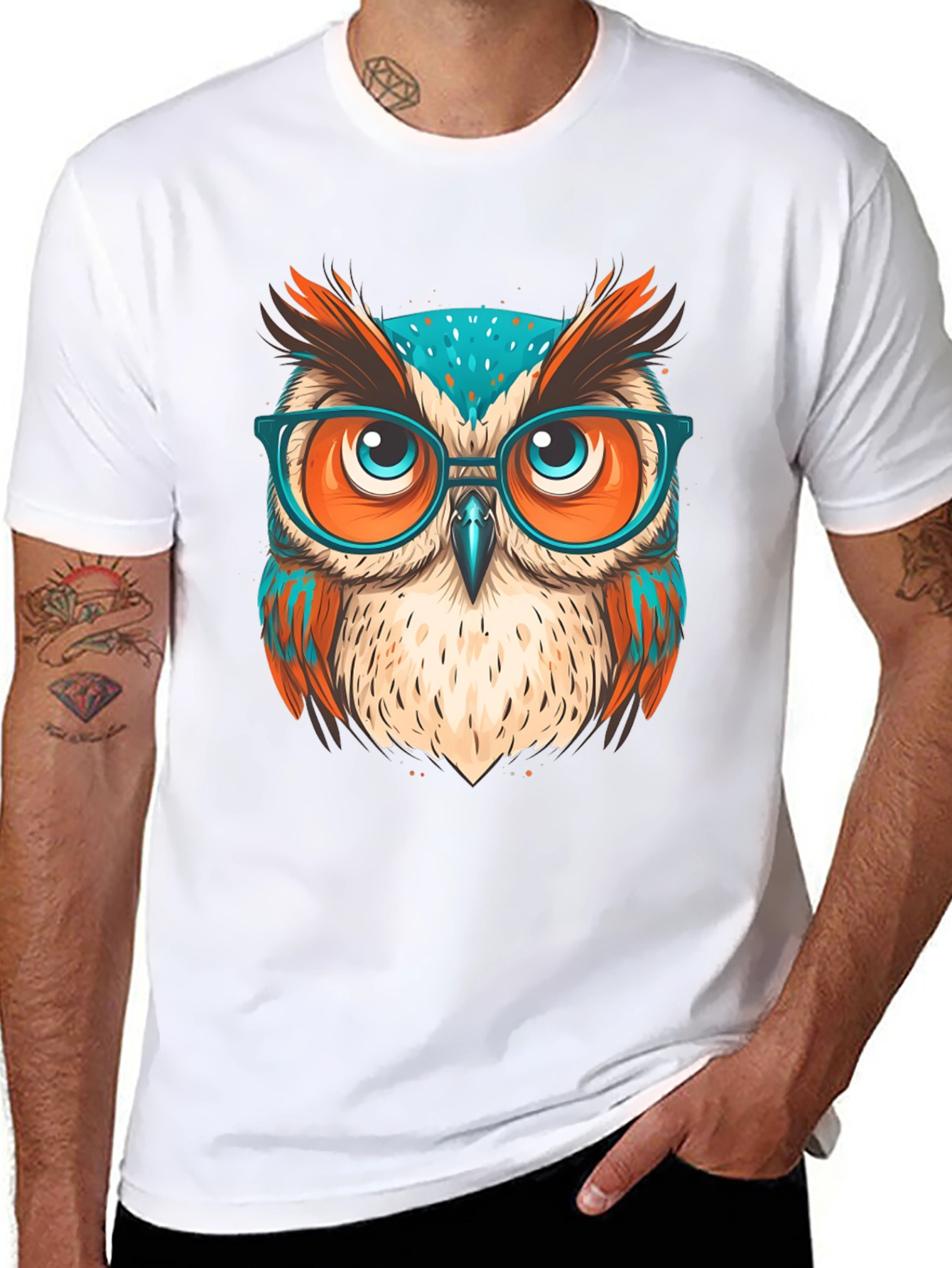 Show off your quirky side with this unique black t-shirt! Featuring a vibrant and detailed graphic of an owl wearing glasses, this tee is sure to turn heads. The design boasts bright turquoise, orange, and cream hues, making it pop against the classic black background. Made from a comfortable-looking fabric, it's perfect for everyday wear. Ideal for casual outings, showing off your love for animals, or adding a touch of fun to your wardrobe. Get yours today and let your style take flight!
