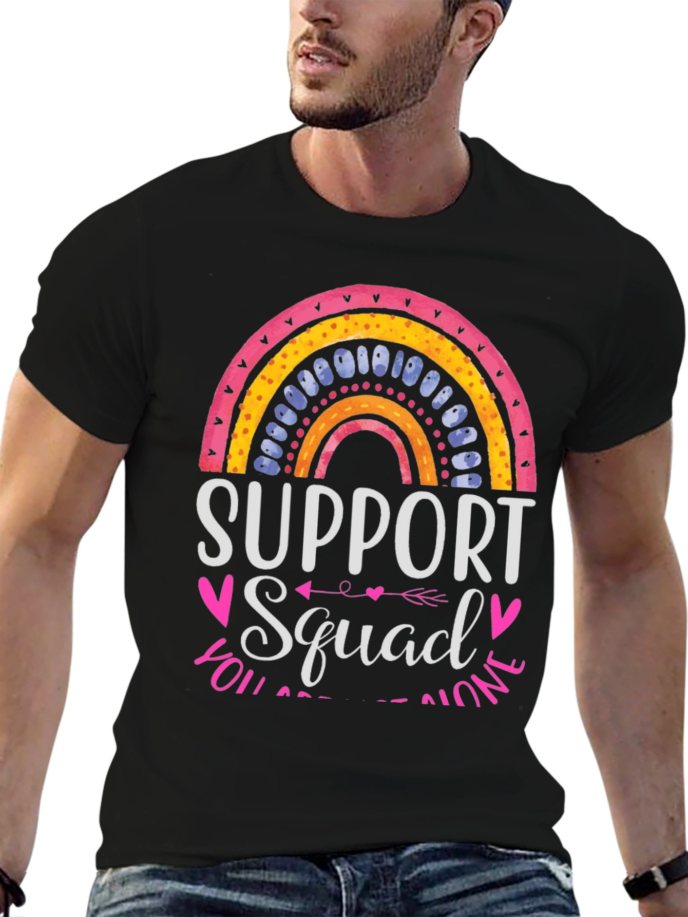 Show your support with this stylish black t-shirt featuring a colorful rainbow graphic. The tee proudly proclaims "Support Squad," making it perfect for advocates, allies, and anyone who wants to spread a message of inclusivity. Made from comfortable material, this tee is ideal for everyday wear, community events, or showing your support at rallies and gatherings. The eye-catching design and positive message make it a great conversation starter. Wear it with pride and let the world know you're part of the support squad!