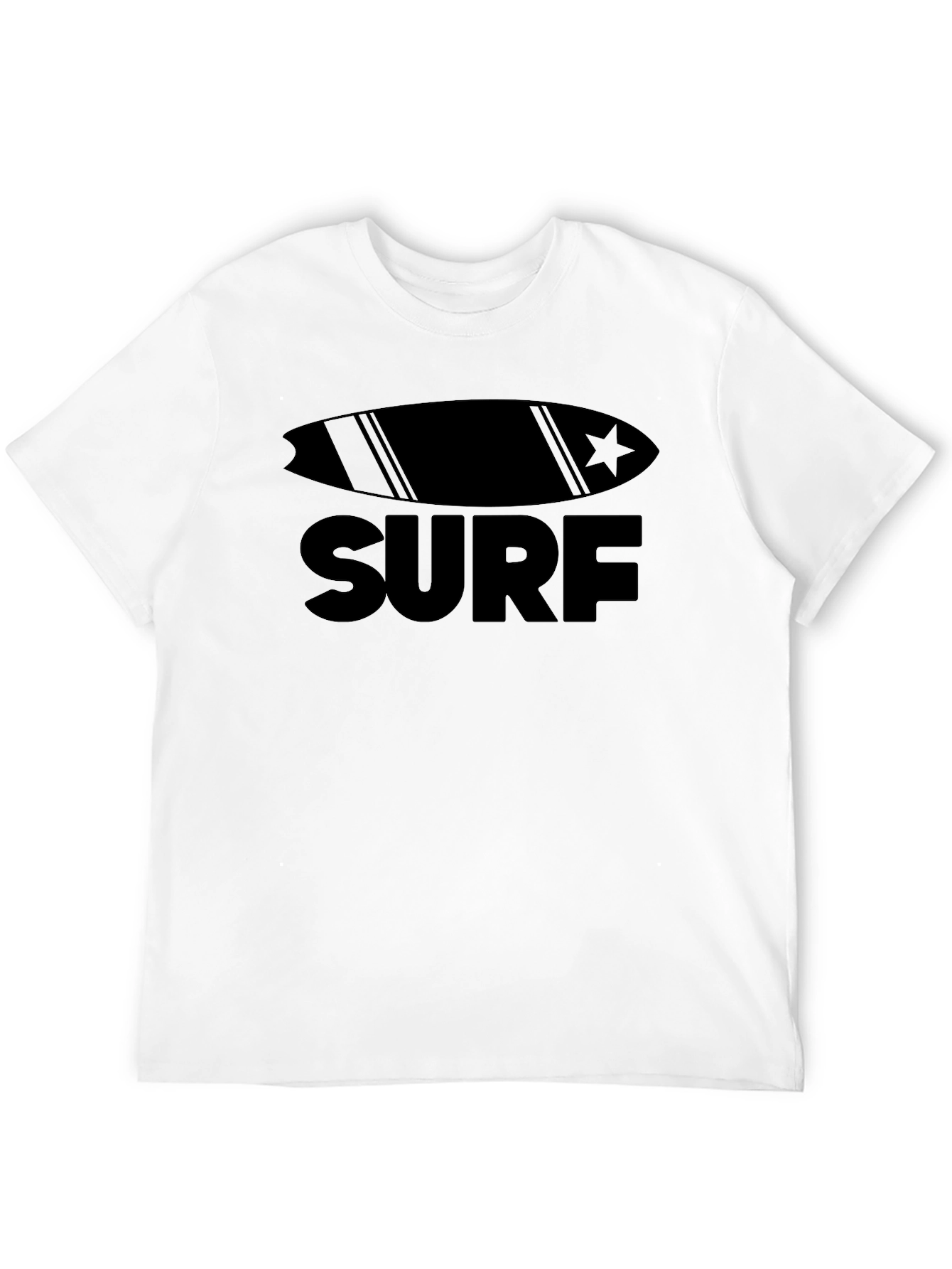 Embrace the surf culture with this classic black t-shirt. The design features a sleek surfboard graphic above the word 'SURF', making it a perfect statement piece for beach lovers and surf enthusiasts. Made from comfortable material, this tee is ideal for casual outings, beach days, or just relaxing. The solid black color allows for easy pairing with jeans, shorts, or your favorite casual bottoms. Show off your love for the waves with this stylish and comfortable t-shirt.