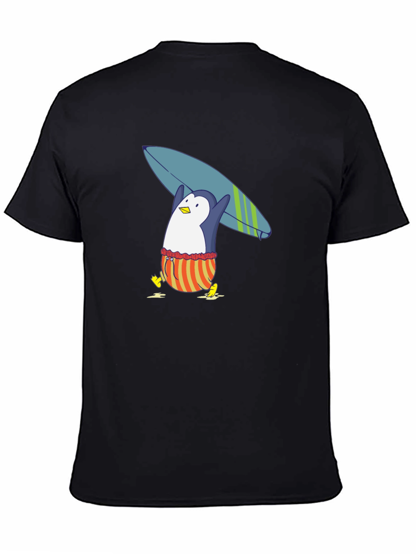 Catch some waves in style with this fun graphic tee! This black cotton t-shirt features a playful penguin character wearing striped shorts and carrying a surfboard. The vibrant design stands out against the classic black backdrop, making it a versatile piece for casual wear. Perfect for beach lovers, surfers, or anyone who enjoys a touch of whimsy in their wardrobe. Made from soft, breathable cotton for all-day comfort. This tee is sure to turn heads and spark conversations wherever you go. Add a splash of fun to your everyday look with this unique penguin surf tee!