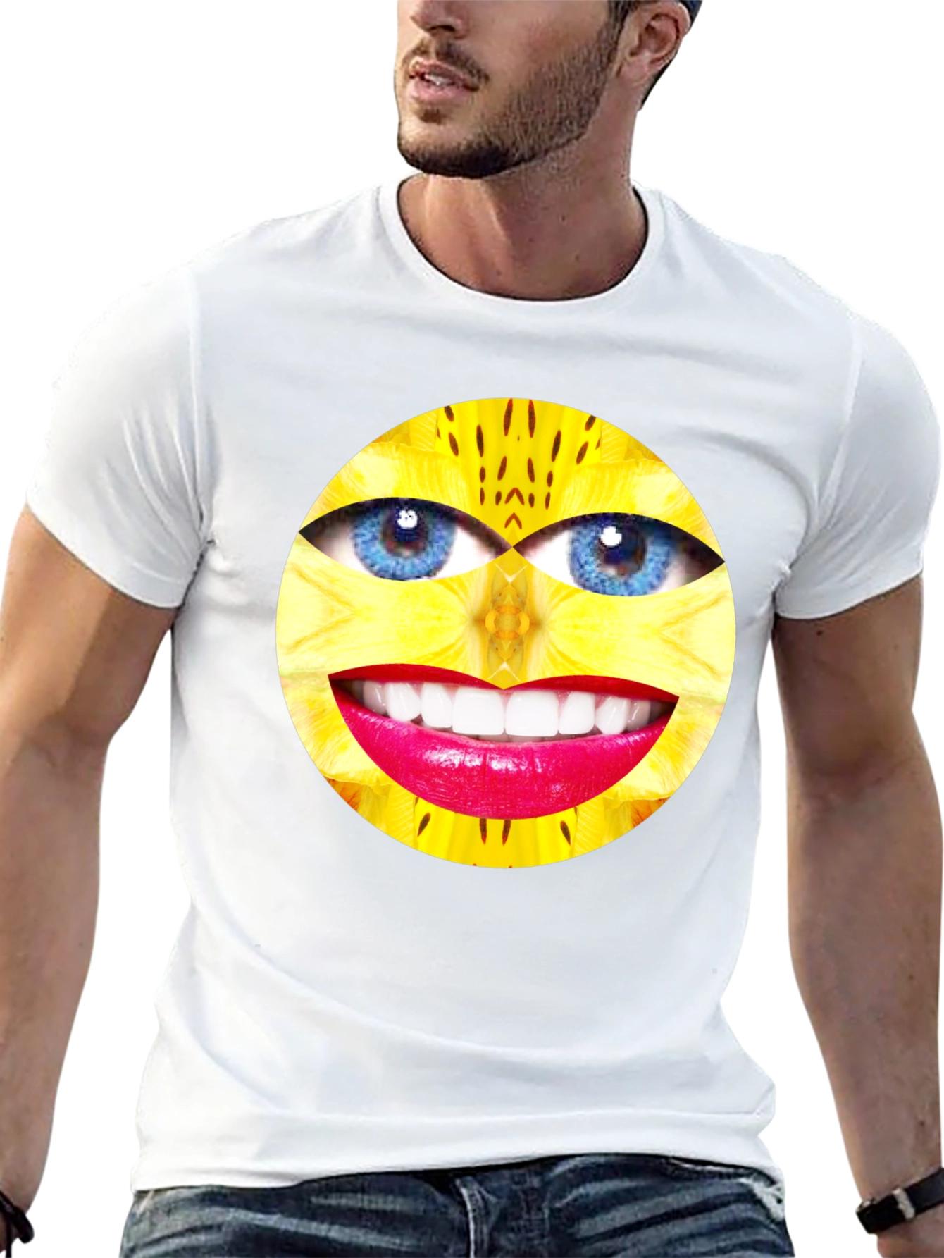 Make a bold statement with this eye-catching black t-shirt featuring a surreal face graphic. The design incorporates bright blue eyes, a vibrant red lipstick smile, and a yellow floral-like background, all formed into a circular face. Made from a comfortable-looking fabric, this tee is perfect for expressing your unique style. Stand out from the crowd and add a touch of unexpected artistry to your everyday wardrobe. Ideal for casual wear, concerts, or artistic events.