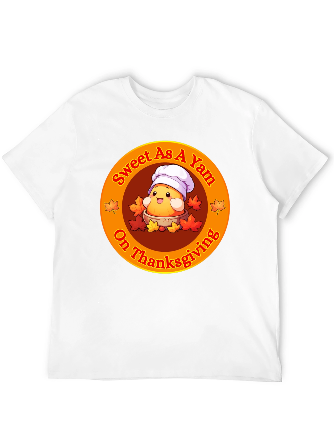 Celebrate Thanksgiving with this adorable t-shirt featuring a cute yam character wearing a chef's hat. The design includes autumn leaves and the playful phrase "Sweet As A Yam On Thanksgiving." The black t-shirt is a comfortable and casual garment suitable for Thanksgiving gatherings, family dinners, or everyday wear to show your holiday spirit. Made from what appears to be a soft and breathable fabric, this tee combines festive charm with classic style. Perfect for those who love Thanksgiving and cute, cheerful designs.
