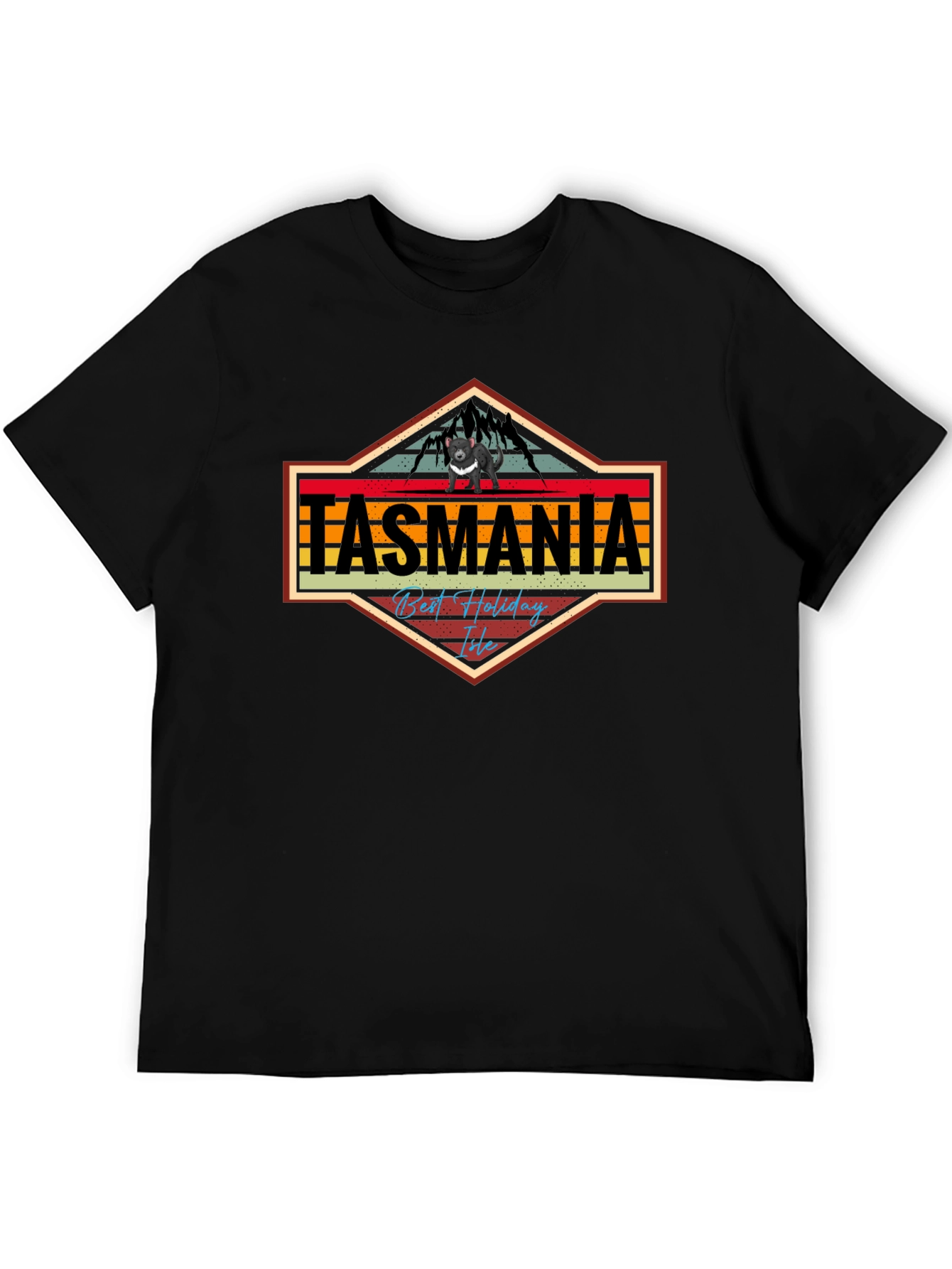 Show off your love for Tasmania with this cool graphic tee! This black t-shirt features a striking, vintage-inspired design with the word "TASMANIA" in bold, colorful lettering. The graphic includes a mountain range silhouette and a unique animal figure, possibly the Tasmanian devil, adding a touch of adventure to the design. Made from comfortable fabric, this tee is perfect for everyday wear or as a souvenir from your trip to Tasmania. It's a stylish and unique way to express your love for this amazing island. Get yours today!
