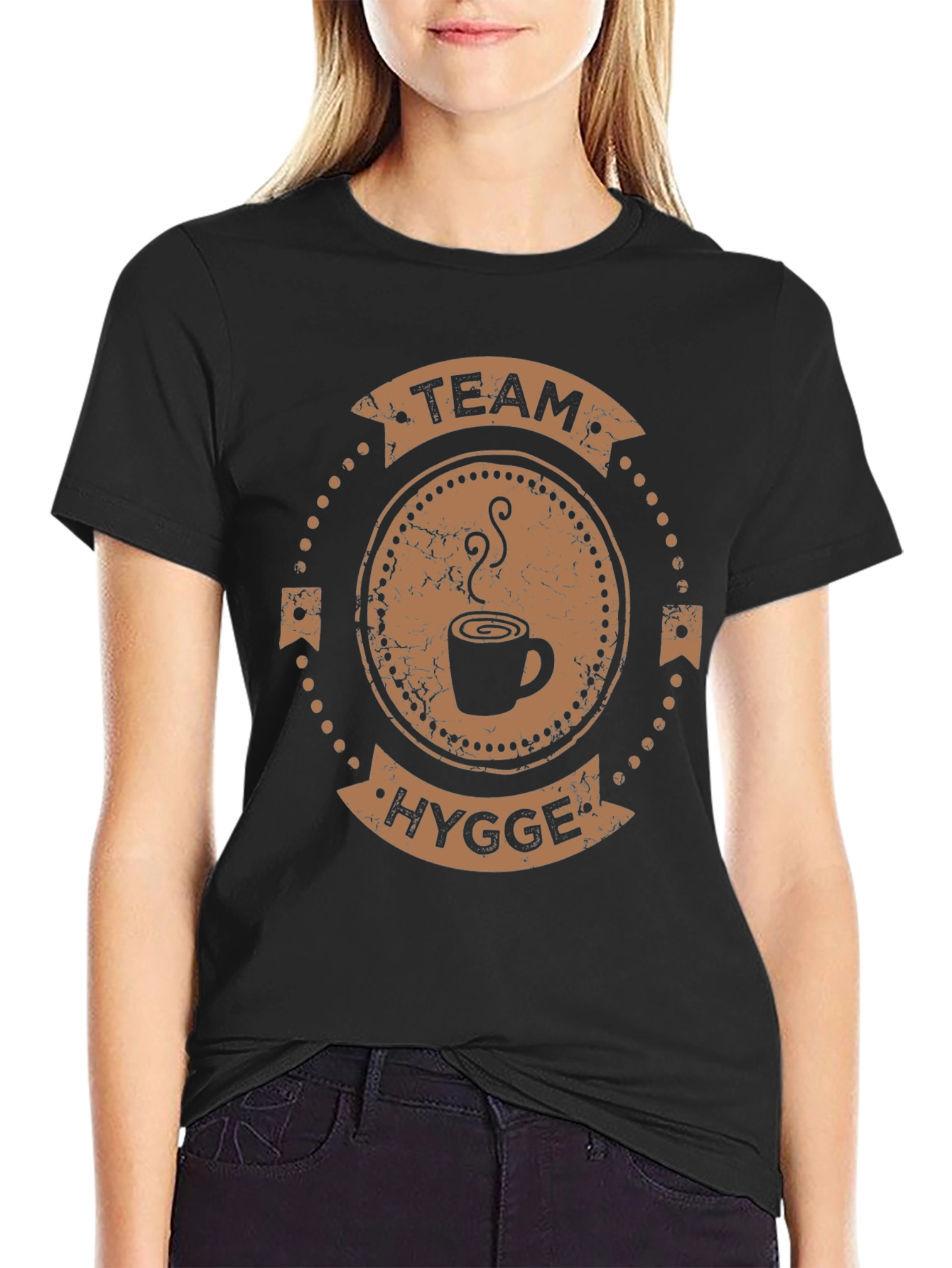 Embrace comfort and style with this 'Team Hygge' themed t-shirt. The design features a rustic-style graphic of a steaming coffee cup encircled by the words 'Team Hygge' in a vintage-inspired font. The print has a distressed look, adding to its charm. Crafted from a soft and comfortable fabric, this tee is perfect for casual wear. Show your love for cozy vibes and relaxed moments with this unique shirt. Ideal for coffee lovers and those who appreciate the hygge lifestyle. Great for lounging at home or meeting friends for coffee.