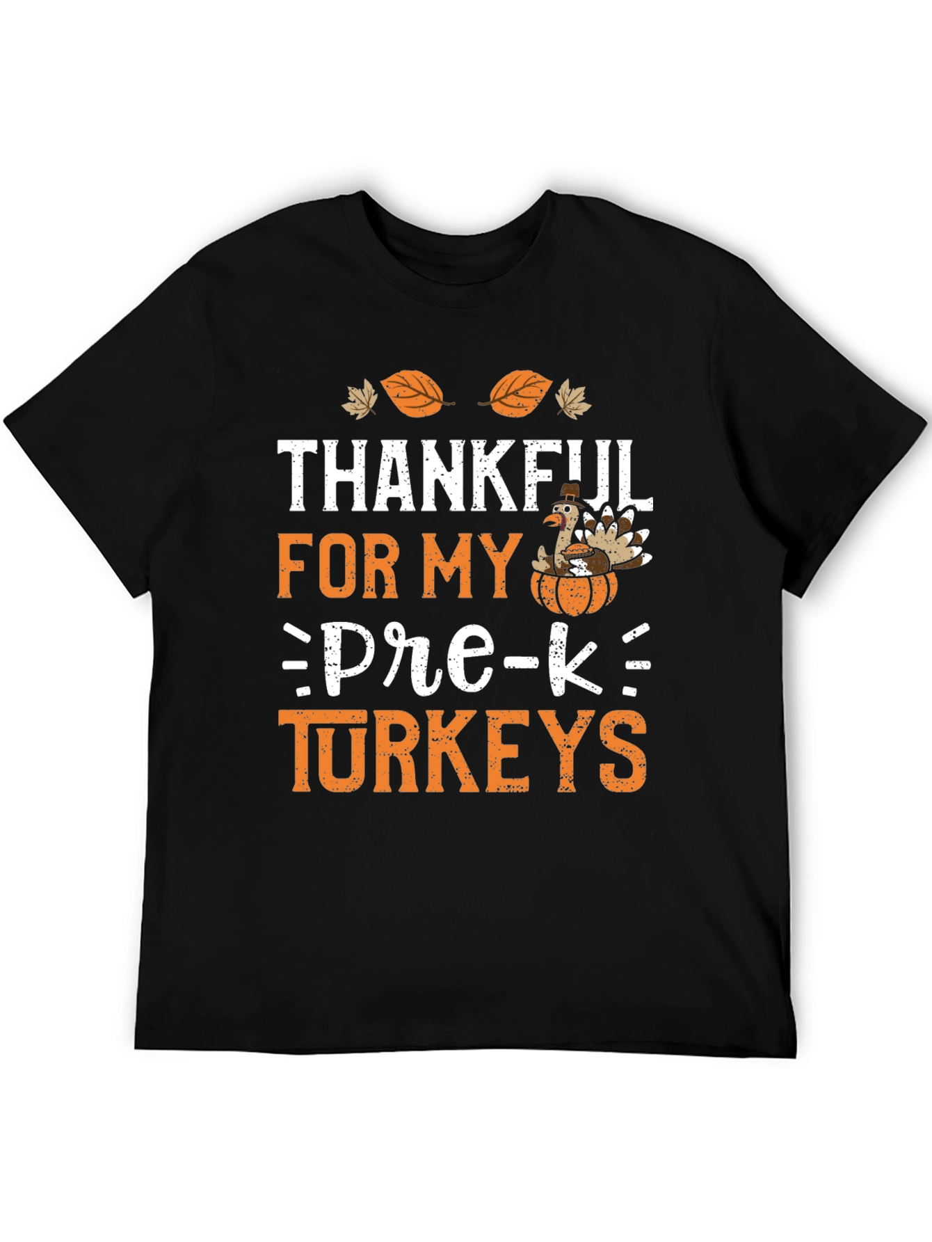 Celebrate Thanksgiving in style with this festive t-shirt! This black tee features a charming graphic design that reads, 'Thankful For My Pre-K Turkeys,' making it perfect for teachers and anyone who loves Thanksgiving. The design includes decorative leaves and a cute turkey illustration, adding a touch of seasonal charm. Made from a comfortable fabric, this shirt is ideal for casual wear during Thanksgiving gatherings, classroom activities, or simply showing your holiday spirit. Get ready to spread some joy and gratitude with this adorable Thanksgiving t-shirt!