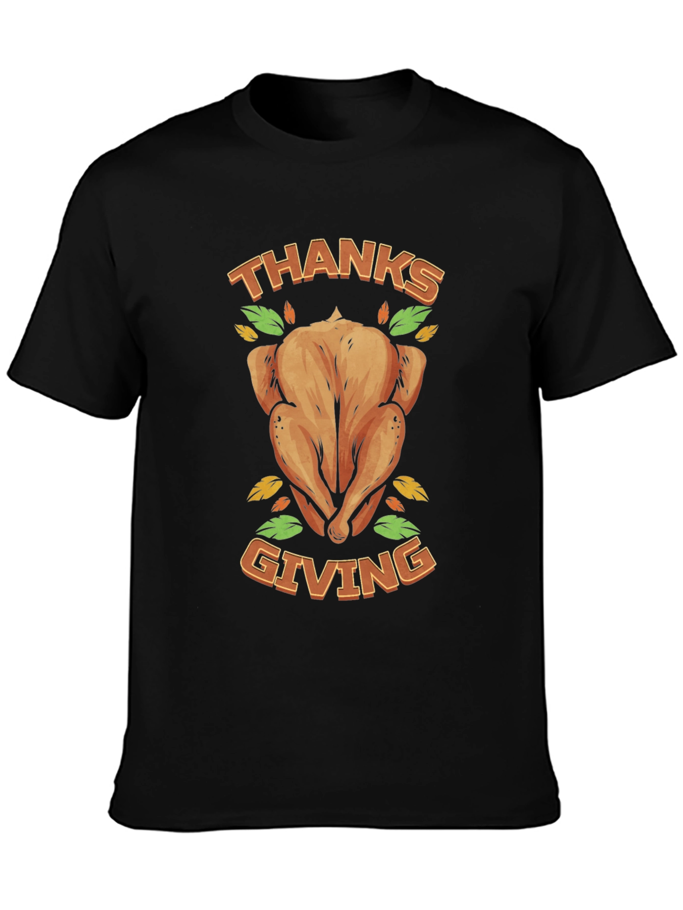 Celebrate Thanksgiving in style with this eye-catching graphic t-shirt. Made from comfortable, breathable fabric, this black tee features a detailed image of a roasted turkey, perfect for the holiday feast. The words "THANKS" and "GIVING" are arranged above and below the turkey, surrounded by colorful autumn leaves. This festive shirt is a fun and unique way to show your holiday spirit. Wear it to Thanksgiving dinner, family gatherings, or any autumn-themed event. Get ready to receive compliments on your awesome Thanksgiving attire!