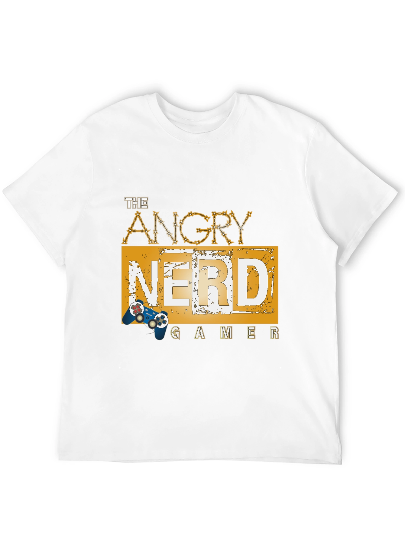 Show off your gaming passion with this unique black t-shirt. The design features the words "The Angry Nerd Gamer" in a stylized font, with a retro gaming console graphic. The design is on a gold block. Perfect for casual wear, gaming events, or as a gift for the avid gamer in your life. Made with comfortable, breathable fabric, this t-shirt combines style and comfort, making it a must-have addition to any gamer's wardrobe.