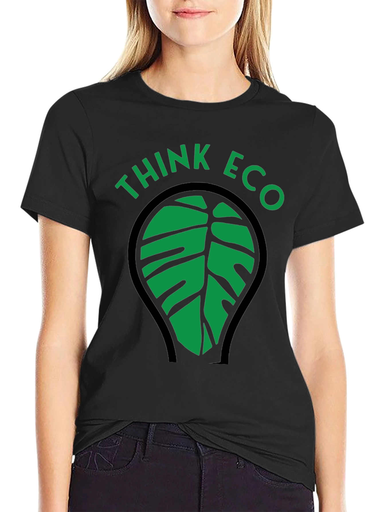Promote eco-consciousness with this stylish black t-shirt. The shirt features a bold green graphic with the words "Think Eco" displayed above a stylized leaf design encased in a bulb shape. Made from comfortable material, this tee is perfect for everyday wear and makes a statement about your commitment to environmental responsibility. Ideal for casual outings, environmental events, or simply expressing your values. Add this eco-friendly fashion piece to your wardrobe and spark conversations about sustainability.