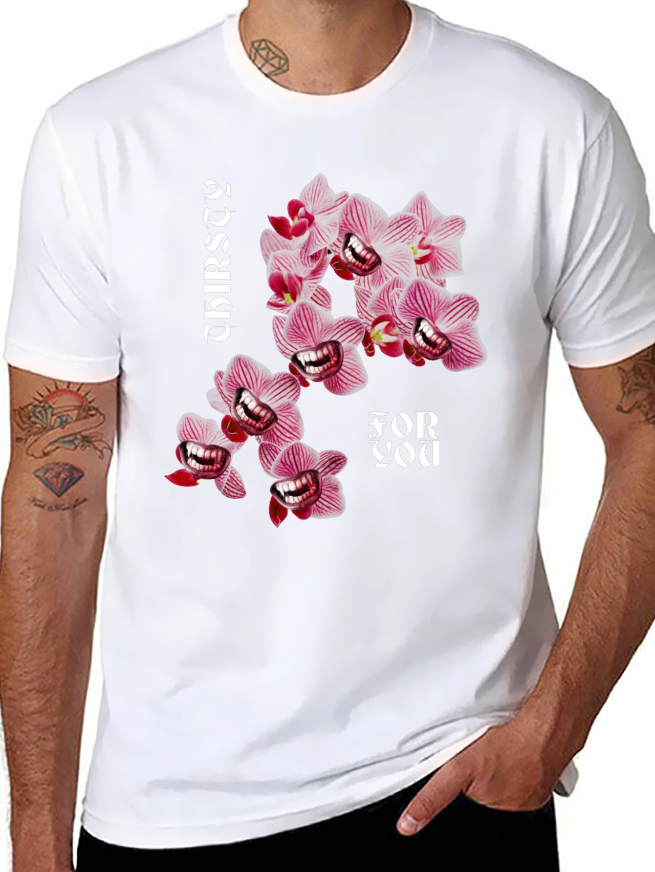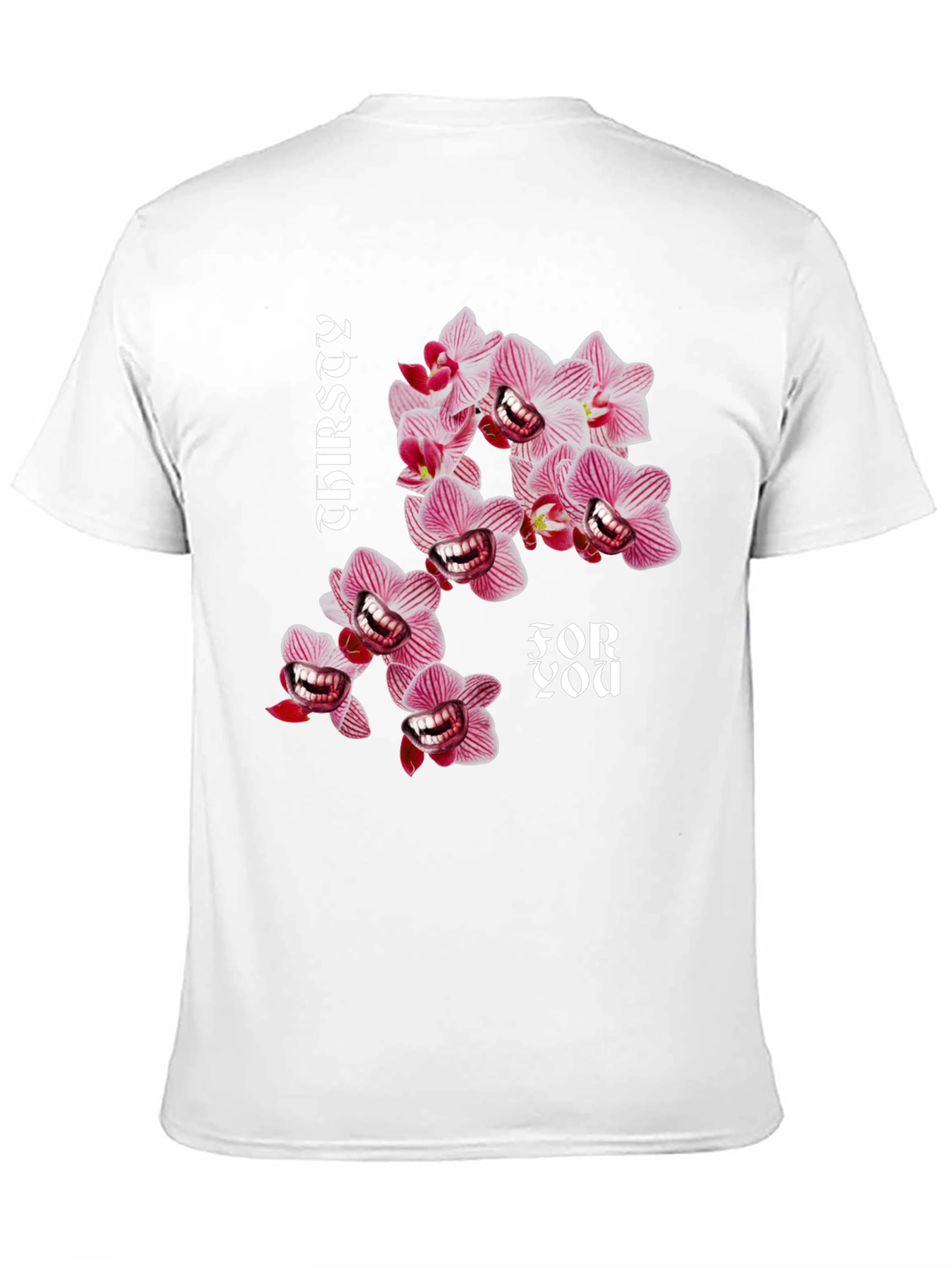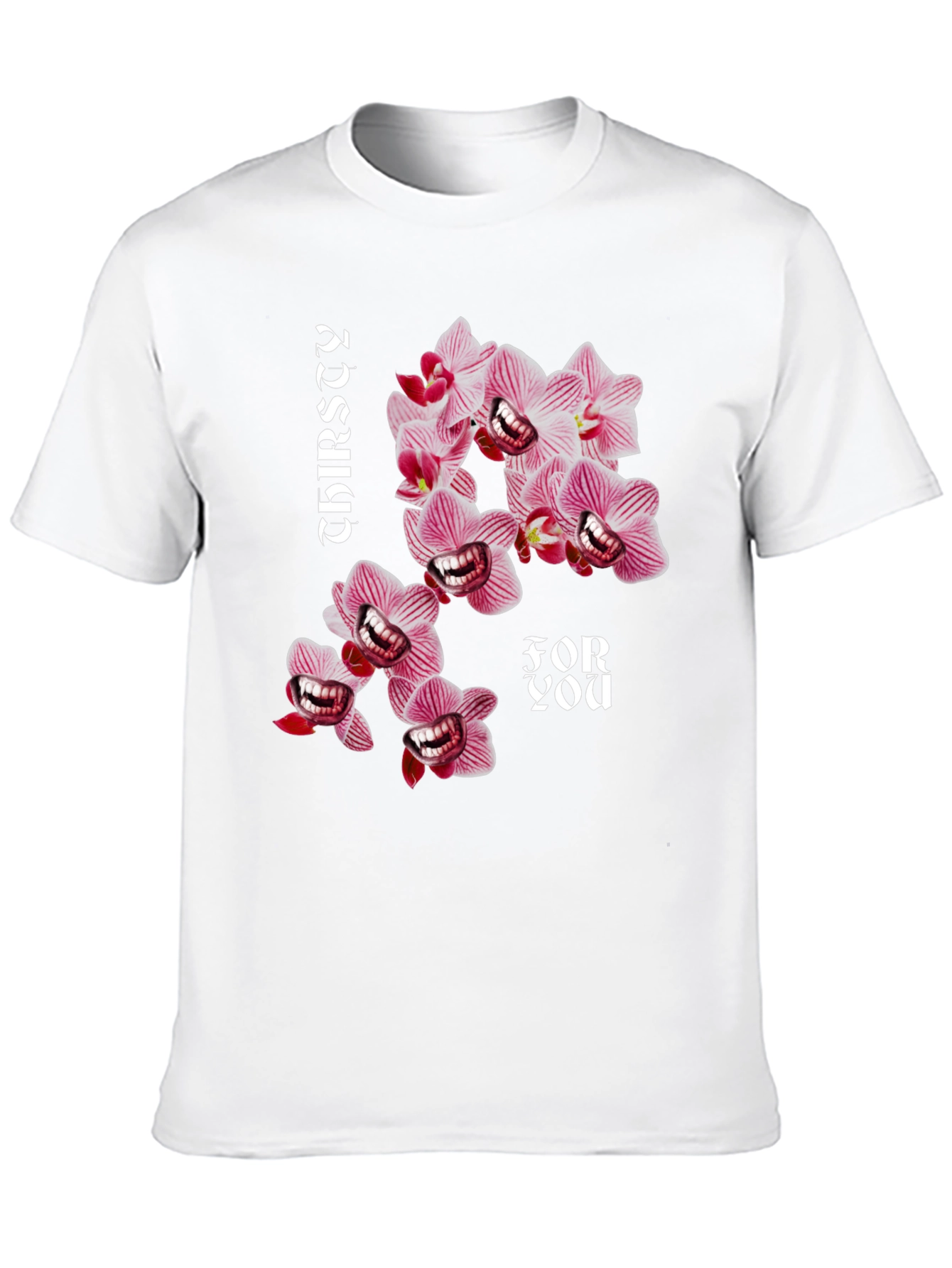 Make a statement with this bold black t-shirt featuring a unique and eye-catching graphic design. The print showcases stylized orchids with a quirky, unexpected twist, accompanied by the text "Thirsty For You." Crafted from a comfortable and durable fabric, this tee is perfect for everyday wear. Whether you're hanging out with friends, heading to a casual event, or just relaxing at home, this t-shirt will add a touch of personality to your outfit. Show off your sense of humor and stand out from the crowd with this must-have graphic tee.