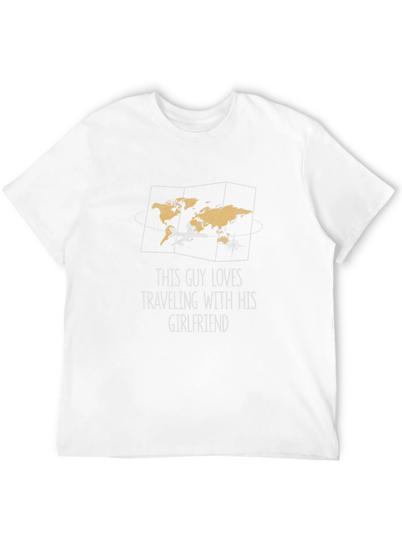 Show off your love for travel with this unique graphic t-shirt. Featuring a stylized world map and airplane design, it's perfect for any travel enthusiast. The shirt proudly declares "This guy loves traveling with his girlfriend." The shirt appears to be made of a comfortable, breathable fabric. It's ideal for casual wear, travel adventures, or as a thoughtful gift for the travel-loving man in your life. Whether you're exploring new cities or relaxing at home, this shirt is a great way to express your passion for seeing the world.