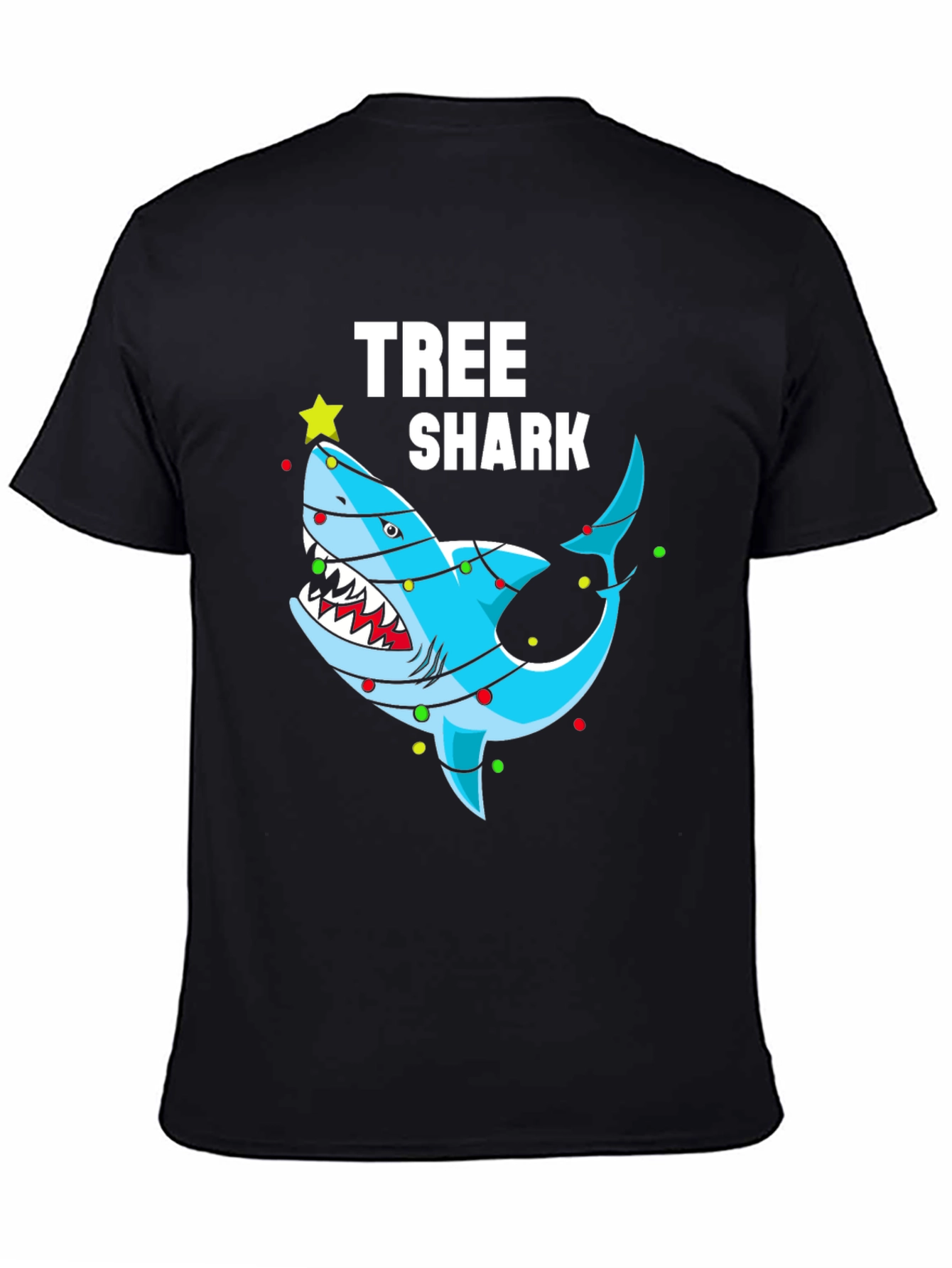 Get ready for the holidays with this unique and festive 'Tree Shark' t-shirt! The shirt features a bold graphic of a blue shark humorously decorated as a Christmas tree, complete with a yellow star on its head and colorful Christmas lights strung around its body. The words 'TREE SHARK' are printed above the shark in clear, white lettering, making the design pop. Made from a comfortable fabric, this t-shirt is perfect for Christmas parties, casual holiday gatherings, or just spreading some cheerful vibes. Wear it to stand out and bring a smile to everyone's face this holiday season!
