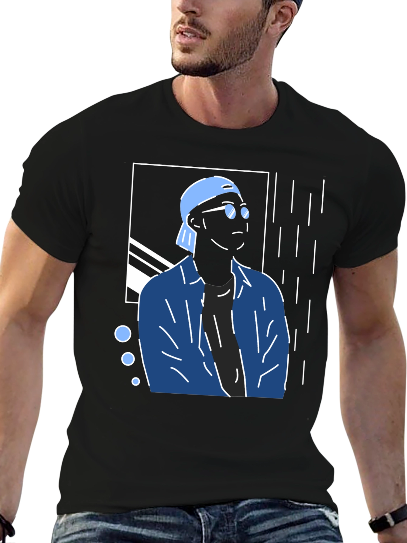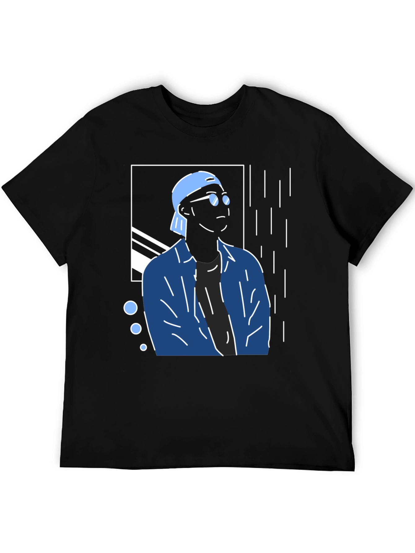 Elevate your wardrobe with this eye-catching graphic tee. This stylish black t-shirt features a unique, modern illustration of a man in sunglasses and a cap, accented with abstract geometric details. The striking blue and white design creates a cool, urban aesthetic. Made from comfortable materials, this tee is perfect for casual wear. Whether you're hanging out with friends or hitting the streets, this tee will keep you looking effortlessly stylish. Pair it with jeans or shorts for a complete, trendy look. Add a touch of artistic flair to your everyday style with this awesome graphic tee!