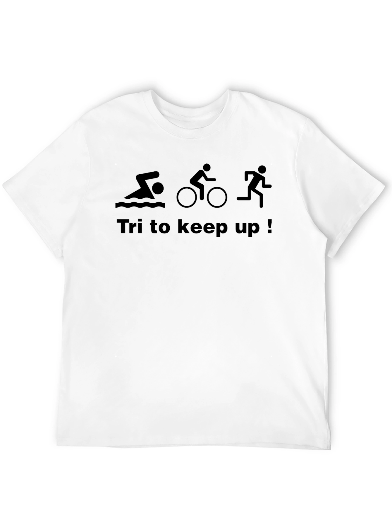 Show off your love for triathlons with this stylish black t-shirt! Featuring a minimalist design of swimming, cycling, and running icons, along with the playful phrase 'Tri to keep up!', this tee is perfect for athletes and triathlon enthusiasts alike. The shirt appears to be made from a comfortable, breathable fabric, ideal for workouts or casual wear. Its classic fit looks great on anyone. Wear it to your next training session, triathlon event, or simply around town to show your passion for the sport. A great gift for any triathlete!