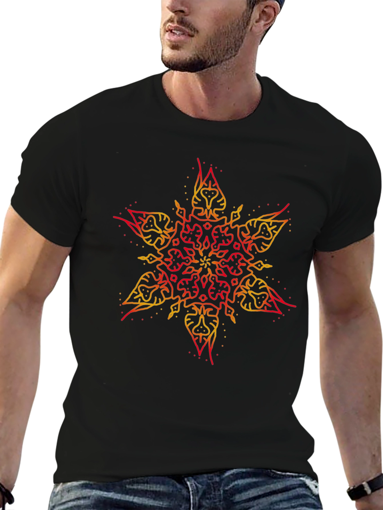 Elevate your casual style with this striking black t-shirt. The shirt features a bold, tribal-inspired star graphic in fiery red and vibrant yellow. The design is eye-catching, making it a standout piece in any wardrobe. Crafted from a soft, comfortable fabric, this tee offers both style and comfort for everyday wear. Perfect for concerts, casual outings, or as a statement piece. The relaxed fit ensures all-day comfort, while the unique graphic adds a touch of individuality to your look. A versatile addition to any wardrobe, this graphic tee is sure to turn heads.
