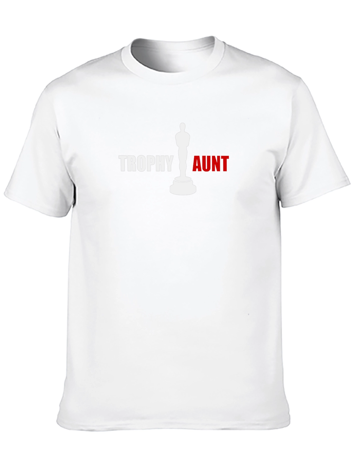 Show off your awesome aunt status with this fun and stylish black t-shirt! The shirt features a unique graphic design with the words "TROPHY" and "AUNT" flanking an Oscar-like statuette. Made from what appears to be a comfortable cotton blend, this short-sleeved tee is perfect for casual wear. It's a great way for aunts to showcase their special bond with their nieces and nephews. Ideal for family gatherings, casual outings, or just relaxing at home, this eye-catching shirt is sure to spark conversations and smiles. Get yours today and let the world know you're a trophy aunt!