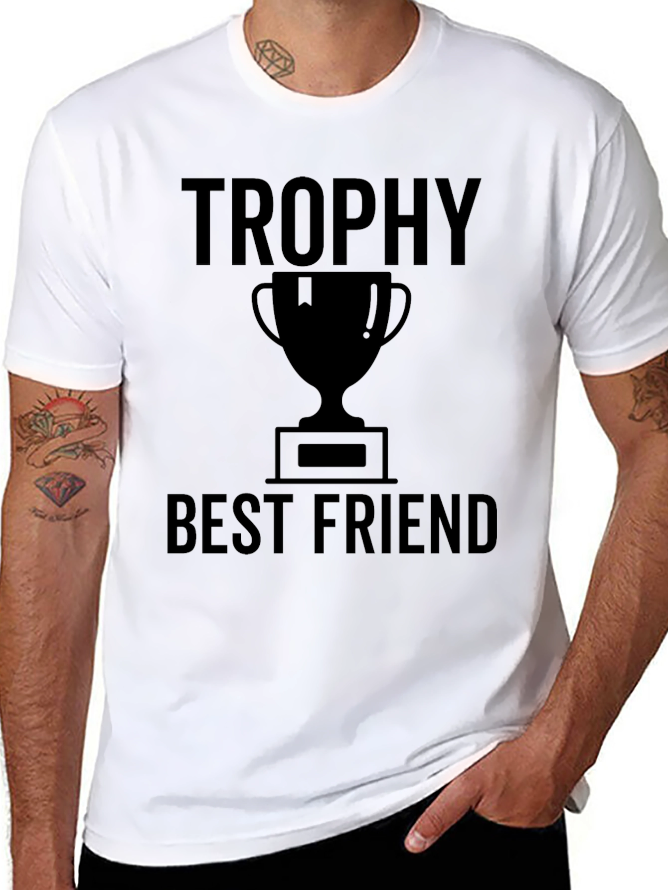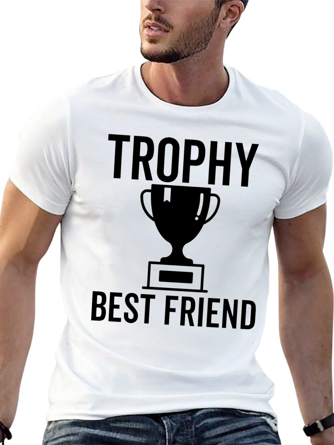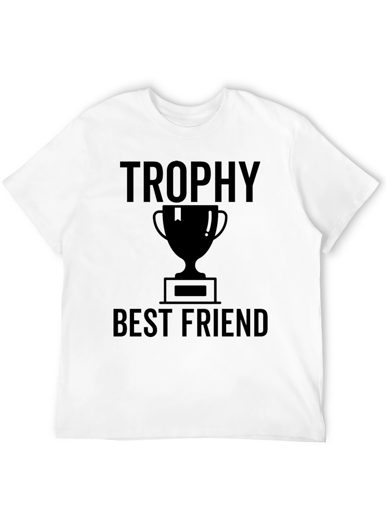 Showcase your appreciation for your best friend with this stylish black graphic t-shirt. The shirt features a bold "Trophy" inscription above a trophy graphic, followed by "Best Friend" text. This design makes a statement and is perfect for celebrating your special bond. Made from a comfortable material, it's ideal for casual wear, friend gatherings, or as a thoughtful gift for your closest pal. Wear your friendship proudly with this unique t-shirt.