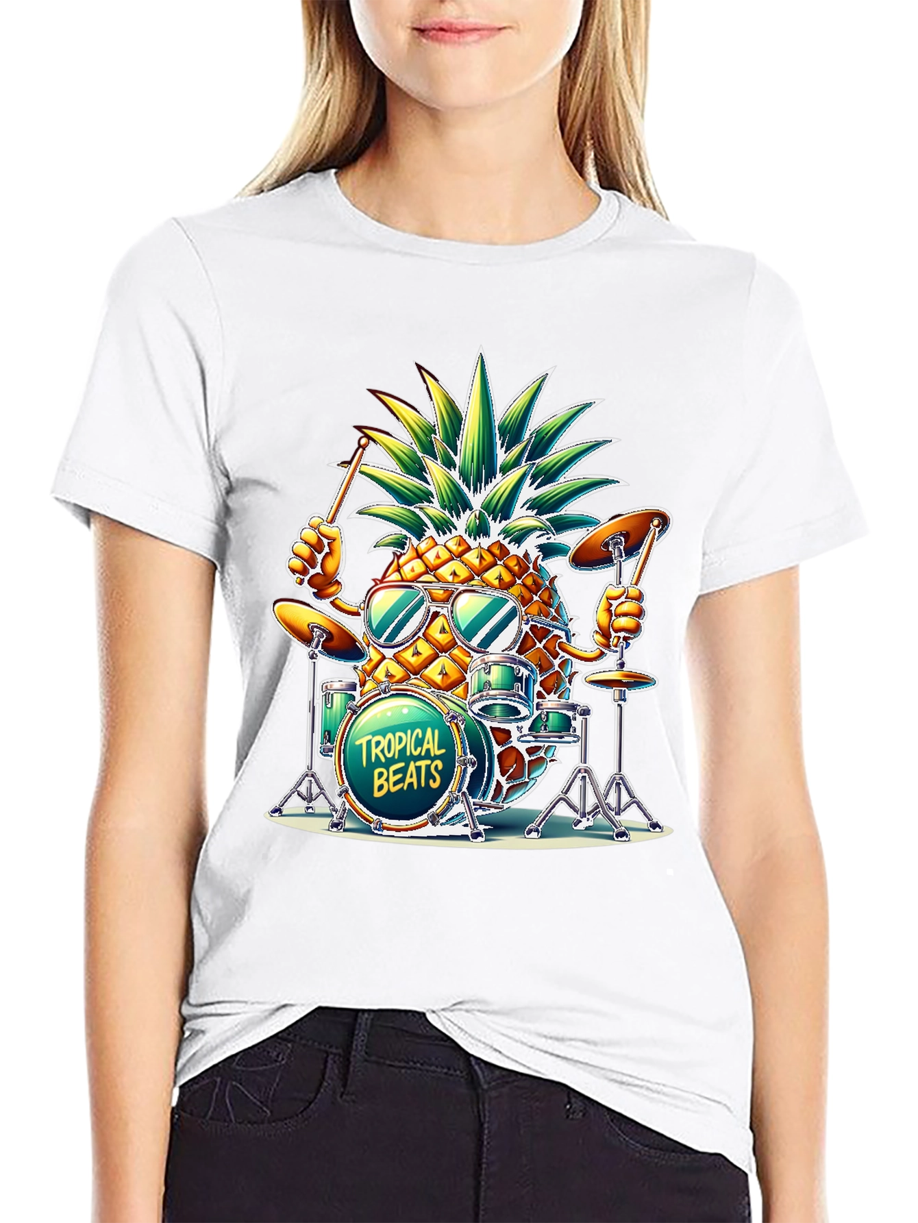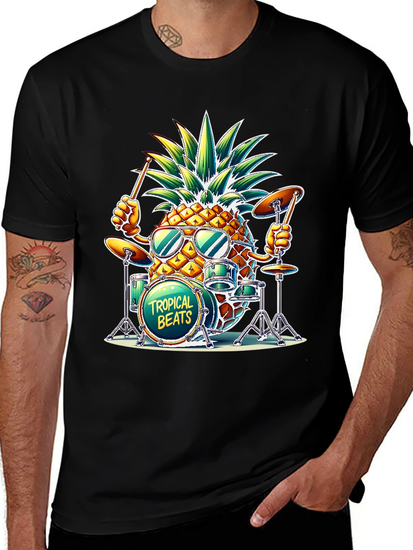 Rock a tropical vibe with this cool black T-shirt! It features a playful graphic of a pineapple drummer with sunglasses, surrounded by his drum set that reads "Tropical Beats." The design pops with vibrant colors and adds a fun, quirky touch to your wardrobe. Made with comfortable materials for all-day wear, this tee is perfect for music lovers, beachgoers, or anyone who wants to stand out with unique style. Get ready to make some noise and show off your tropical groove!
