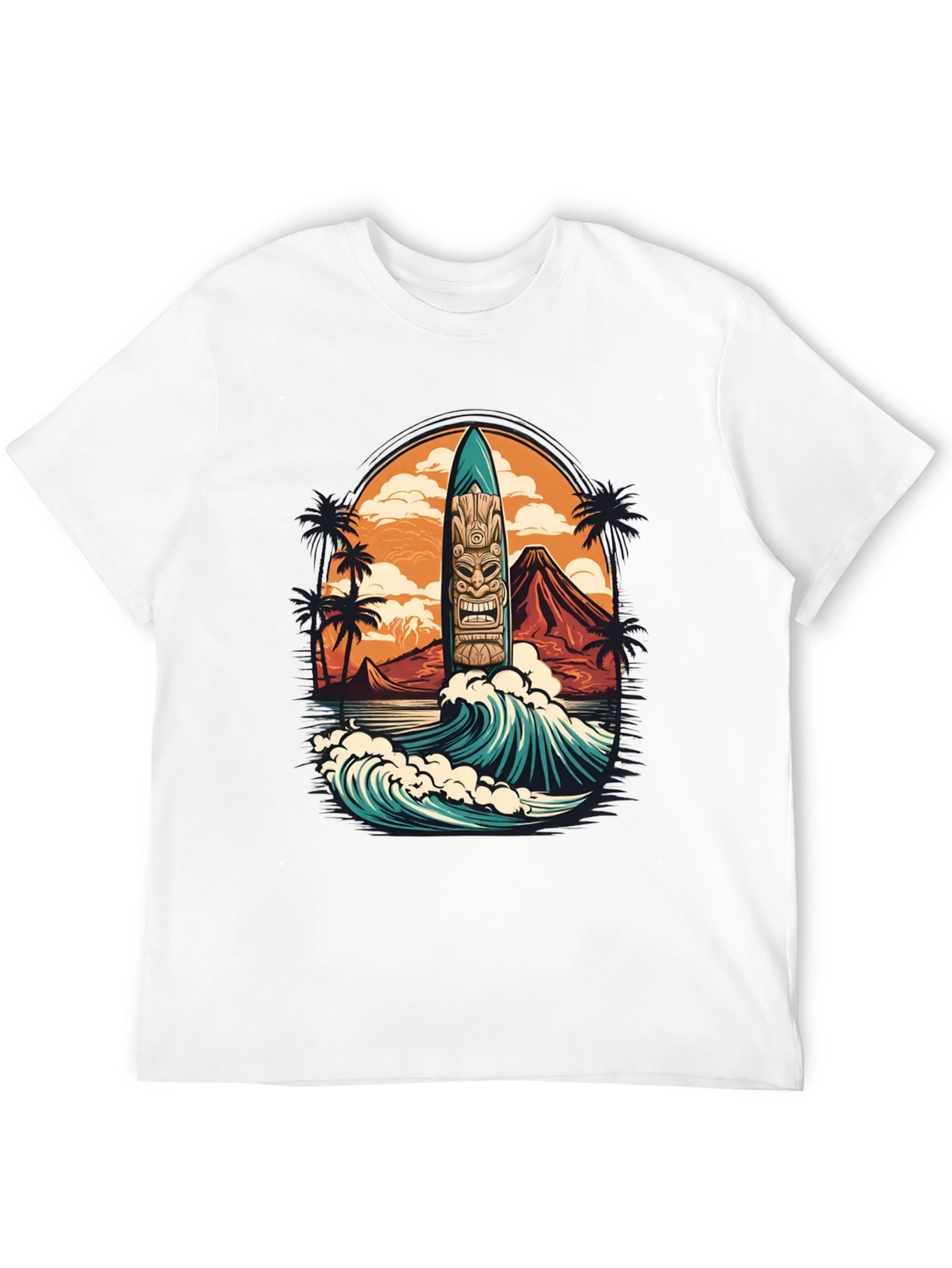Embrace island vibes with this stylish black graphic tee. The design showcases a vibrant Tiki surfboard standing tall amidst crashing blue waves, framed by a sunset landscape with palm trees and a distant mountain. The detailed graphic print offers a unique and eye-catching look. Perfect for casual wear, beach outings, or as a standout piece in your everyday wardrobe. Made from comfortable materials for a relaxed fit. Show off your love for surfing and tropical culture with this must-have tee!