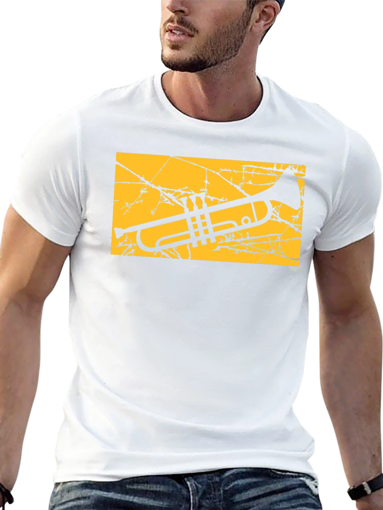 Elevate your casual style with this striking black T-shirt featuring a bold graphic of a trumpet. The design incorporates a vintage, distressed effect with a yellow backdrop that adds a touch of edgy sophistication. Made from comfortable, breathable fabric, this tee is perfect for everyday wear. Show off your love for music, whether you're a musician or simply appreciate the art form. This unique design makes it a standout piece. Pair it with jeans or shorts for a relaxed yet stylish look that's sure to turn heads. Ideal for music lovers and fashion-forward individuals alike.