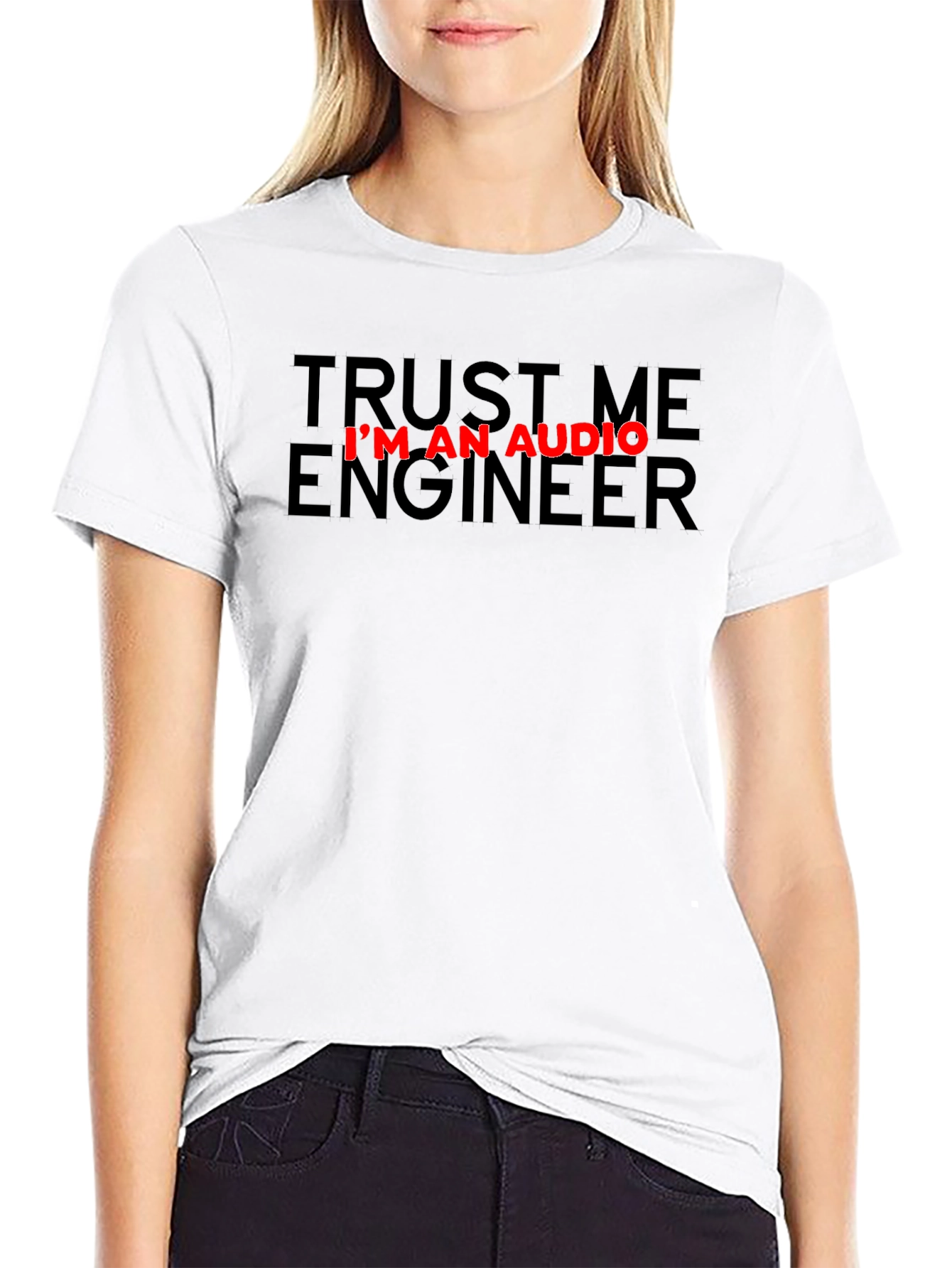 This black t-shirt features a bold statement: "Trust Me I'm An Audio Engineer." The phrase is printed in contrasting colors, with "I'M AN AUDIO" in eye-catching red, drawing attention to the wearer's profession. Made from a soft, comfortable fabric, this shirt is perfect for casual wear. It's an ideal conversation starter for audio enthusiasts, sound engineers, music producers, or anyone in the audio industry. Whether you're at a studio session, concert, or just hanging out, let everyone know you're the go-to person for all things audio with this stylish and fun t-shirt.