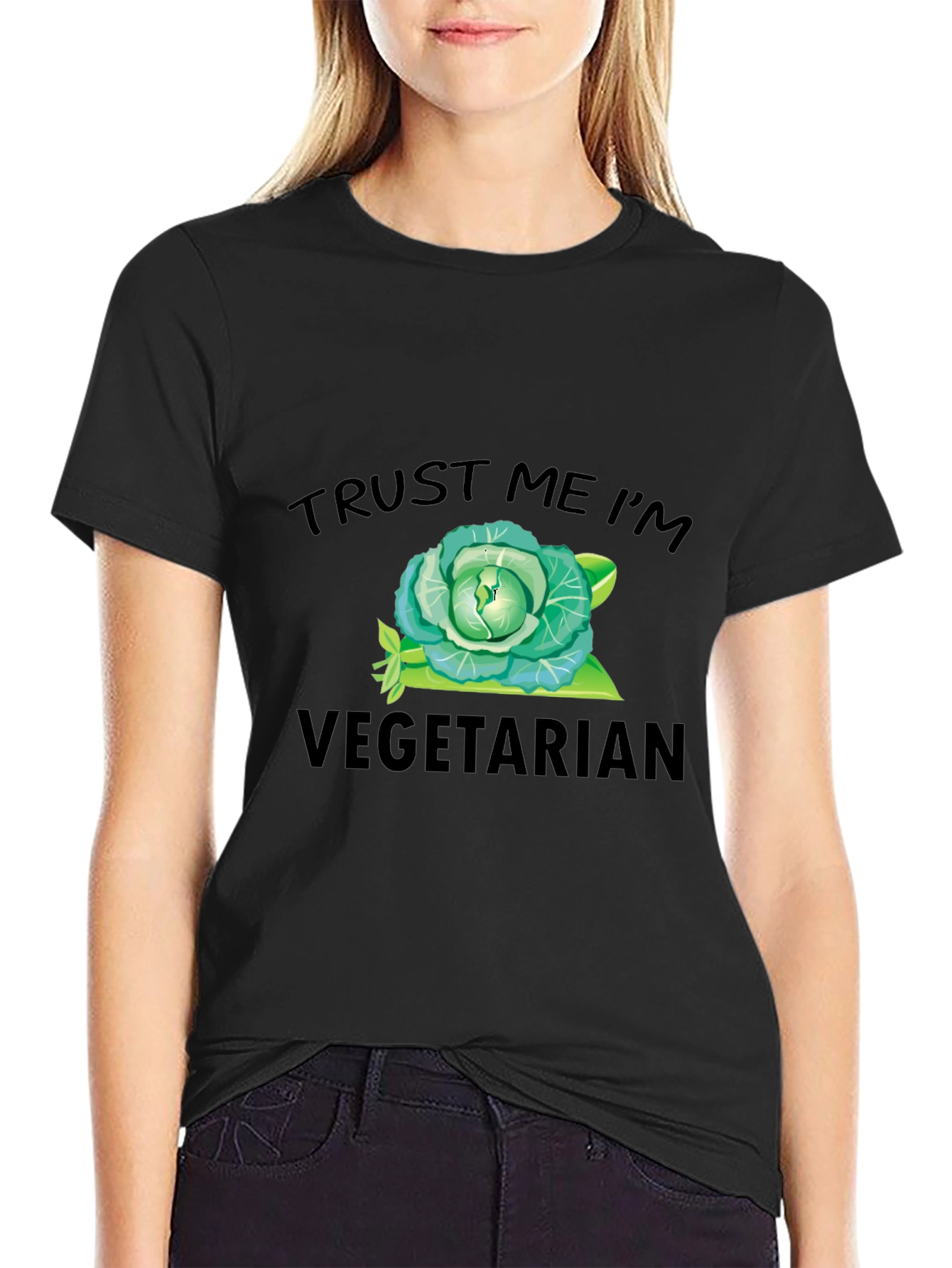 Show off your love for veggies with this humorous black t-shirt. It features a playful design with the text "Trust Me I'm Vegetarian" above and below an image of a head of cabbage. This funny and comfortable tee is perfect for vegetarians, vegans, or anyone who appreciates a good joke. Made from soft, breathable fabric, it's ideal for casual wear, gatherings with friends, or making a statement at your next grocery store visit. Get yours today!