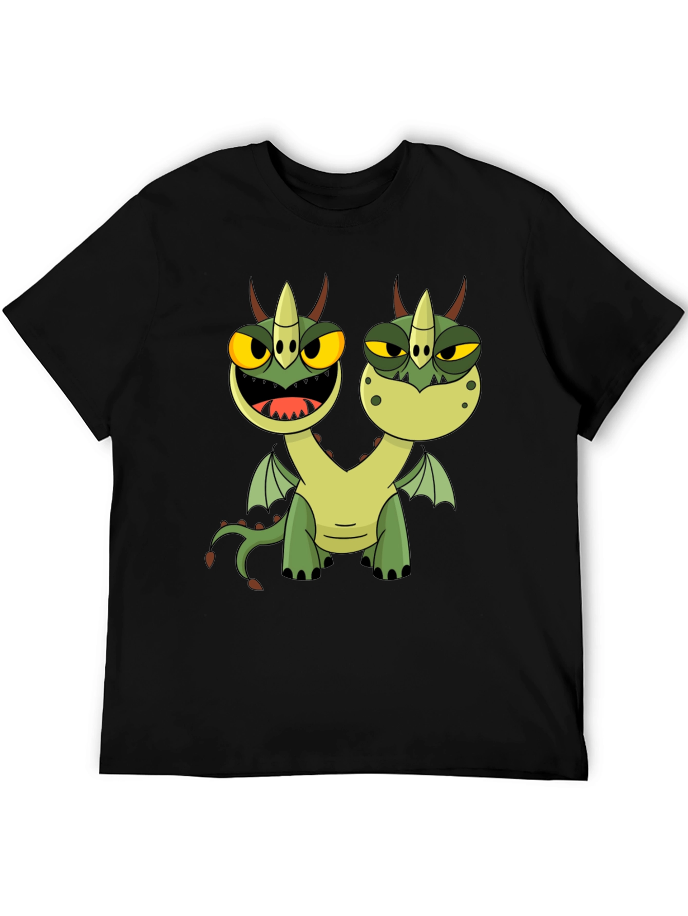 This unique black T-shirt features a vibrant cartoon graphic of a two-headed green dragon. With its playful design, this shirt is sure to turn heads. The dragon has a light green belly, small wings, and a tail with brown spots, adding to its whimsical charm. Perfect for casual wear, this T-shirt is ideal for dragon enthusiasts, cartoon lovers, or anyone looking to add a touch of fun to their wardrobe. Show off your unique style with this eye-catching and comfortable tee. It's a great conversation starter and a fun way to express your personality. Get yours today and unleash your inner dragon!
