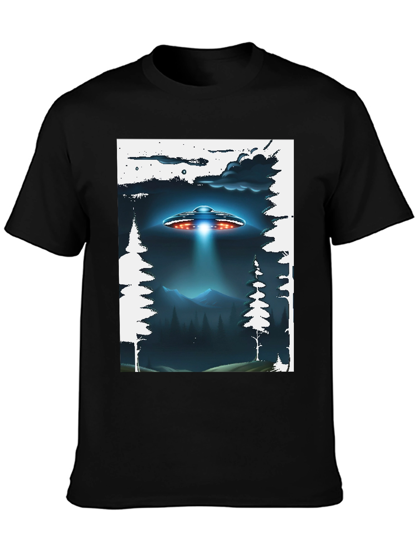 This black t-shirt features a striking graphic design of a UFO hovering over a forest landscape, complete with silhouetted trees and distant mountains. The otherworldly scene creates a unique and eye-catching look. Made from comfortable, breathable fabric, this tee is perfect for casual wear, sci-fi enthusiasts, or anyone who loves unique and artistic designs. The vivid print is sure to spark conversations and add a touch of mystery to your wardrobe. Ideal for everyday wear or as a standout piece for a casual gathering. A must-have for those who dare to express their individuality.