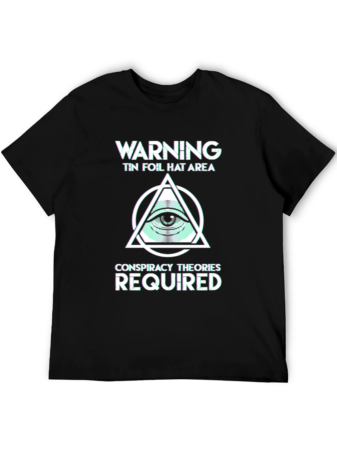 Embrace your inner conspiracy theorist with this eye-catching black t-shirt. Featuring a bold design with the text "WARNING TIN FOIL HAT AREA" and "CONSPIRACY THEORIES REQUIRED" surrounding an all-seeing eye in a pyramid, this shirt is sure to spark conversations. The design has a glitch effect, giving it a modern edge. Made from a comfortable fabric, this tee is perfect for casual wear, conventions, or simply expressing your unique sense of humor and skepticism.