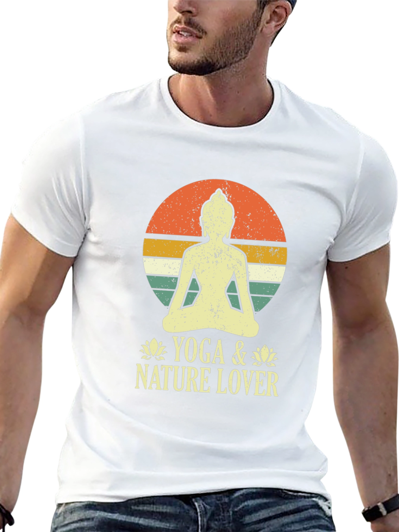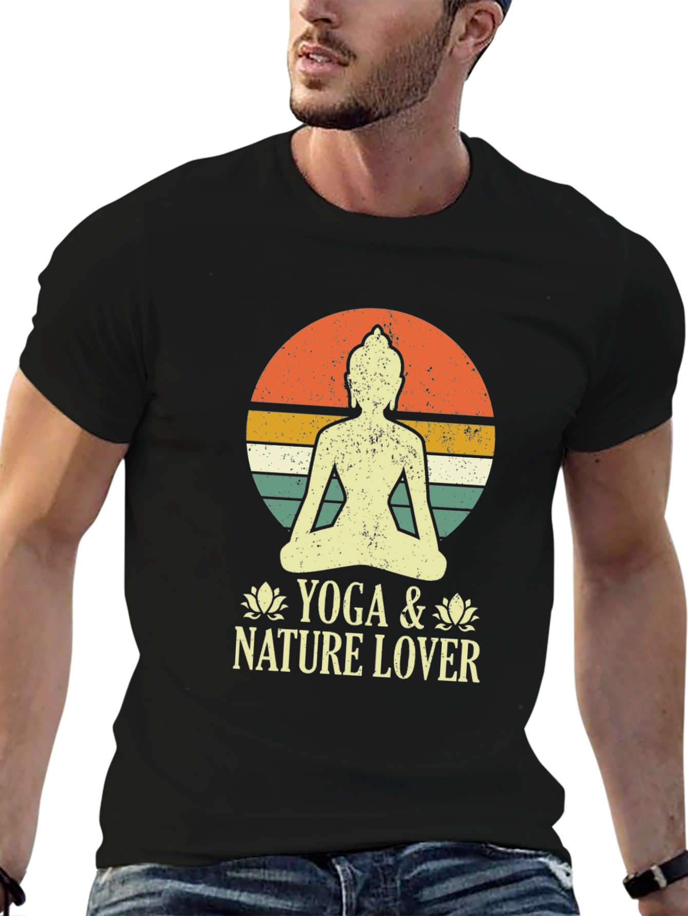Embrace your inner peace and love for nature with this unique graphic tee. Featuring a stylized yoga silhouette set against a retro sunset backdrop, this shirt is perfect for yoga enthusiasts and outdoor adventurers alike. The design also includes the words 'Yoga & Nature Lover' and lotus flower accents. Made from comfortable fabric, this classic black tee offers a relaxed fit for all-day wear. Whether you're hitting the yoga studio, exploring the trails, or simply relaxing at home, this shirt is a stylish and meaningful way to express your passions. The print has a vintage distressed look. Let your love for yoga and nature shine!