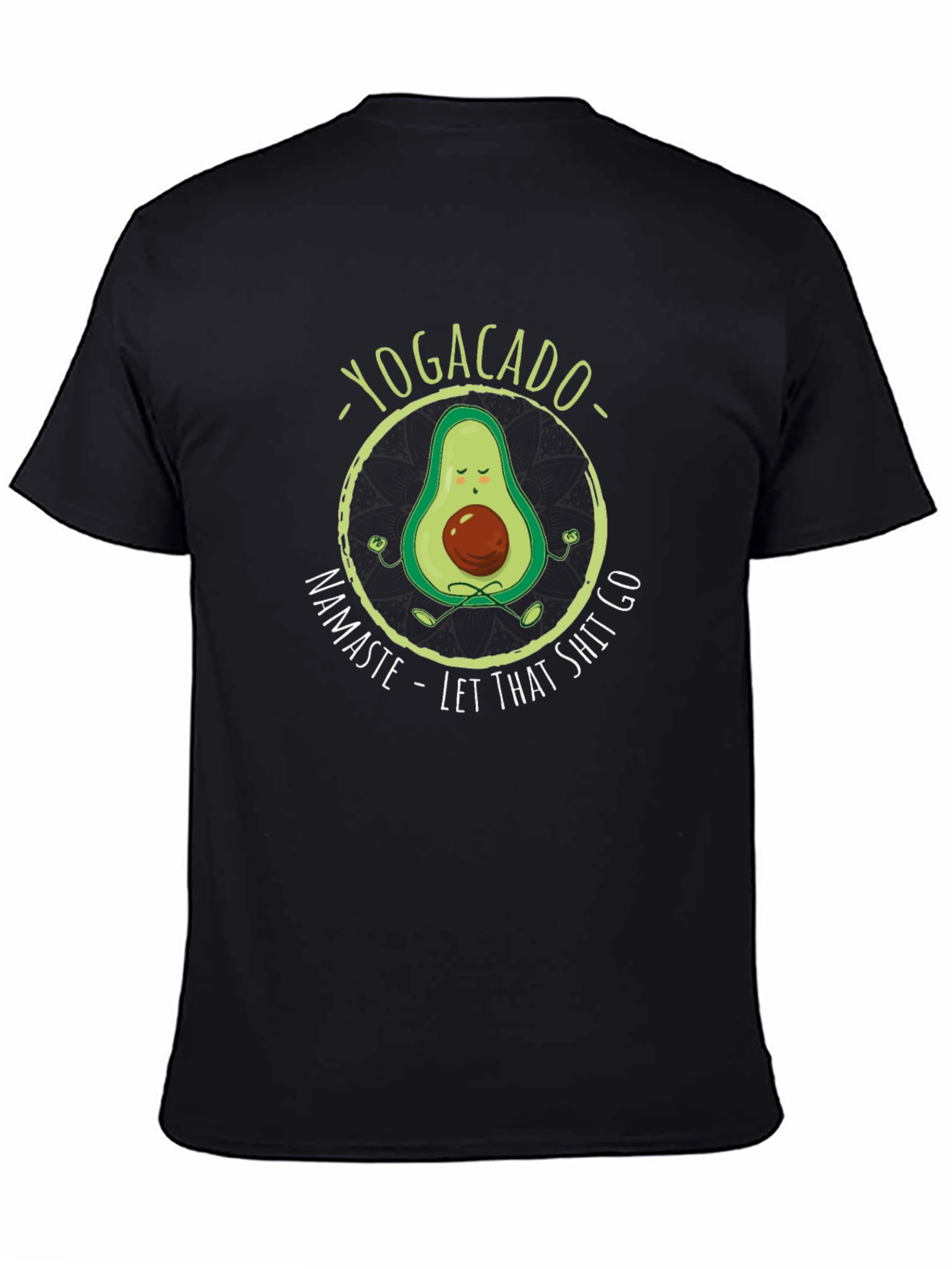 Find your inner peace with this unique black graphic tee. Featuring a fun avocado meditating in a yoga pose, this shirt is perfect for yoga enthusiasts and avocado lovers alike. The design includes the playful phrase "YOGACADO" and "NAMASTE - LET THAT SHIT GO" encircling the avocado. Made from soft, comfortable fabric, this shirt is ideal for casual wear, yoga sessions, or a fun conversation starter. Show off your quirky side and relaxed attitude with this eye-catching tee. The detailed graphic design is sure to turn heads and spread smiles. Get yours today!