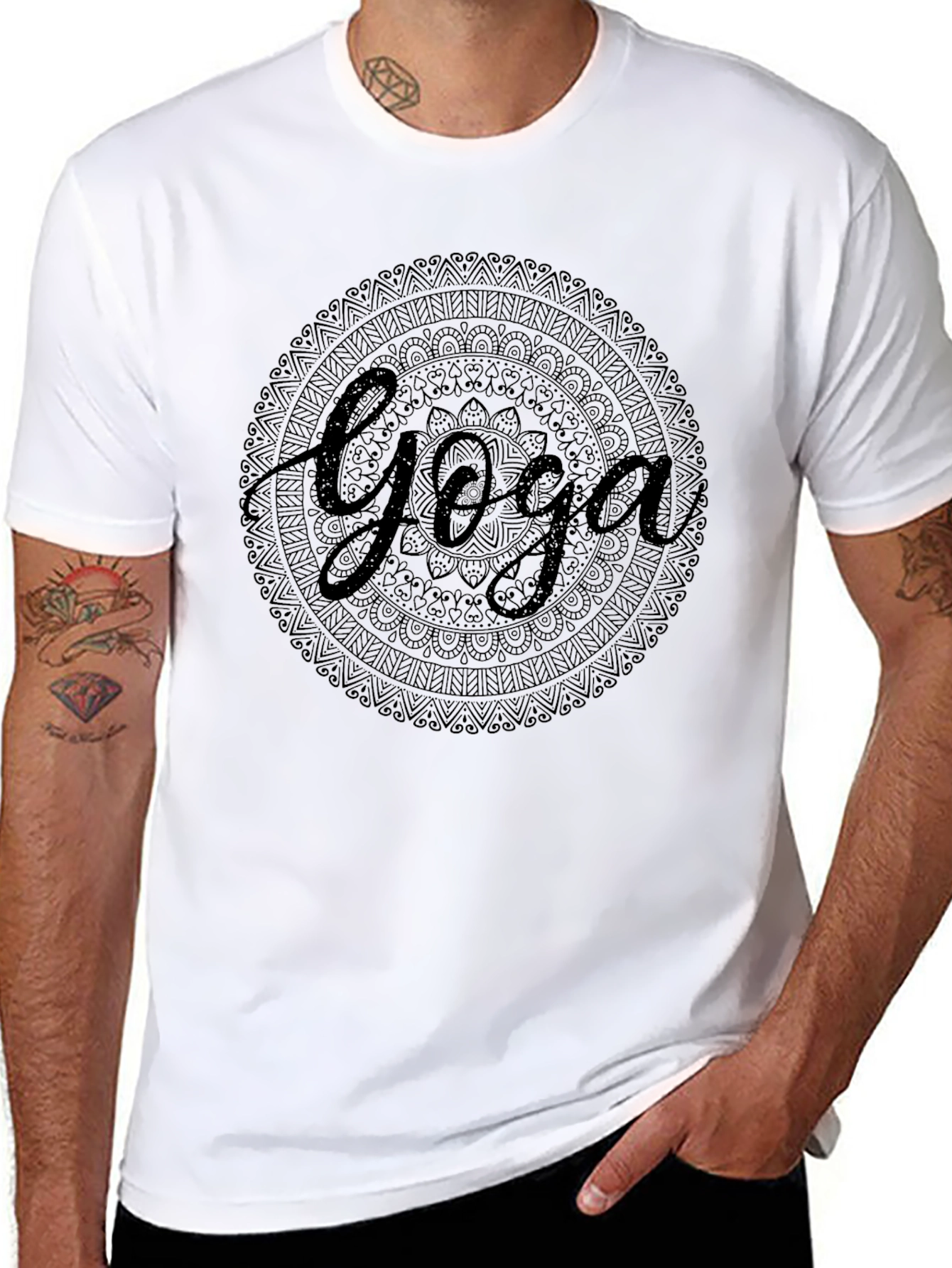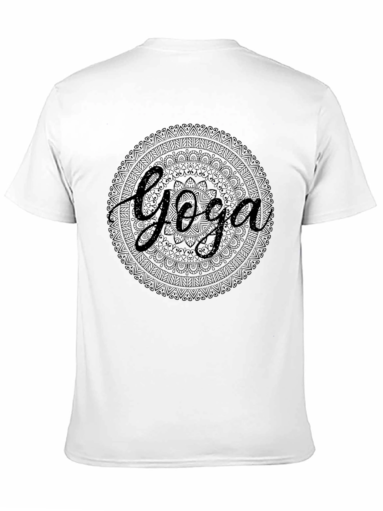 Find your zen with this stylish black t-shirt featuring a subtle yet intricate yoga mandala design. The word 'Yoga' is elegantly scripted in the center. Made from what appears to be a soft and breathable cotton blend, this tee offers a comfortable and relaxed fit, perfect for both your yoga practice and everyday wear. The dark color helps create a sleek, minimalist aesthetic. Pair it with your favorite leggings or jeans for a comfortable and stylish look. This shirt is ideal for yoga enthusiasts seeking to express their passion for mindfulness and well-being.