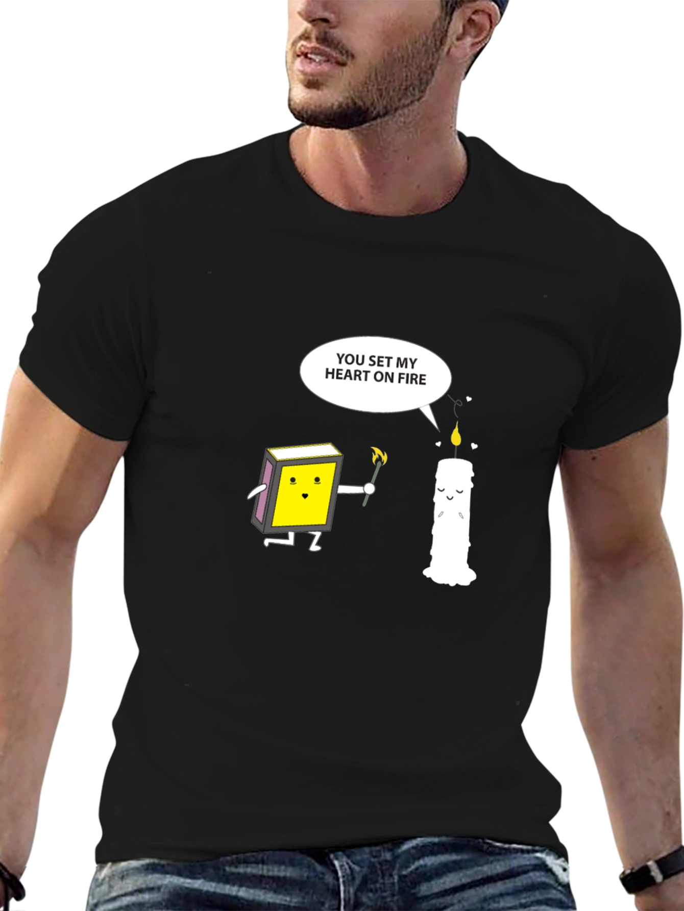 This unique black t-shirt features a playful and romantic graphic design. The design showcases a matchbox character holding a lit match next to a melting candle, with a speech bubble that reads "You Set My Heart on Fire." The tee is likely made from a comfortable and breathable fabric, perfect for casual wear. Show off your fun personality with this eye-catching tee. This tee is ideal for those who love quirky, relationship-themed apparel.